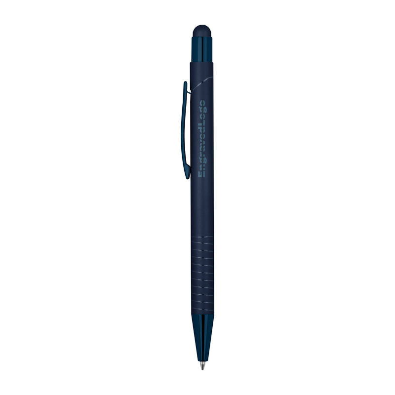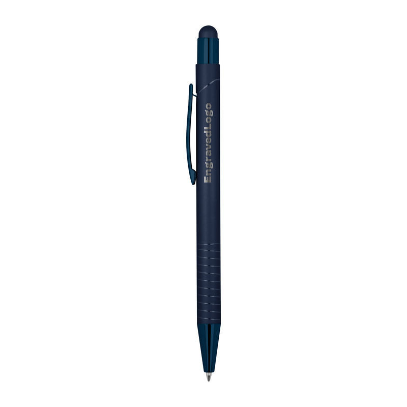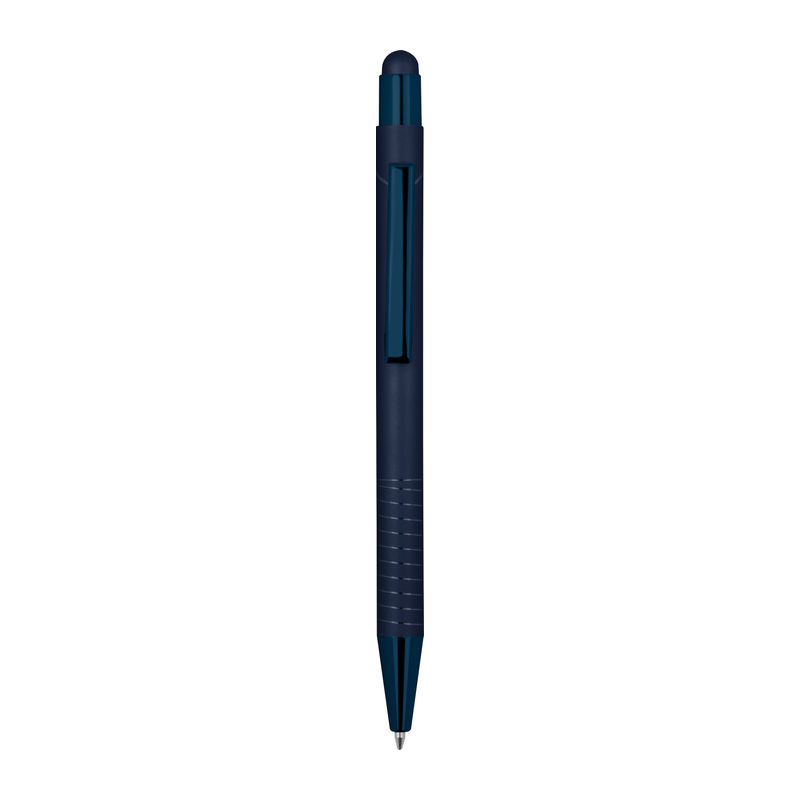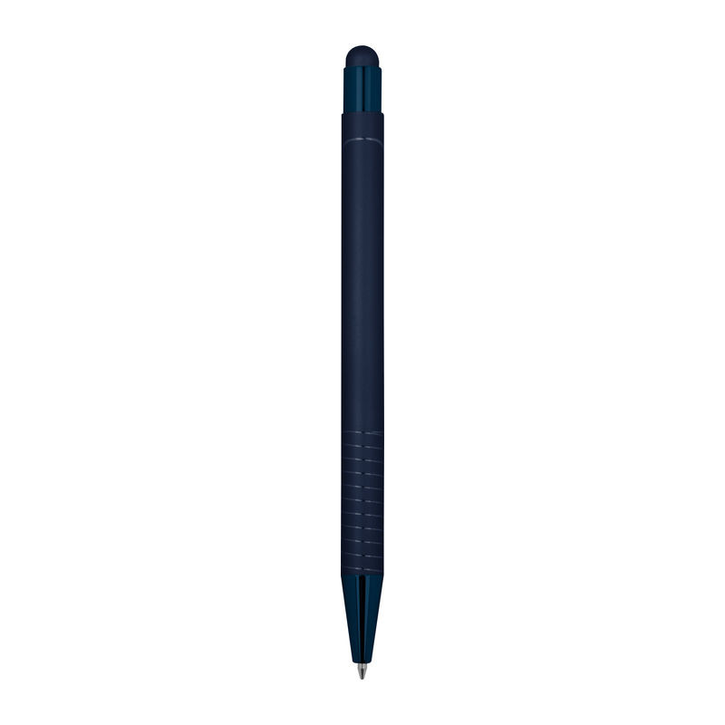Golyóstoll integrált érintővel okostelefonokhoz és táblagépekhez, fényes és a termék színével azonos tükröződő felülettel, kék tintával.