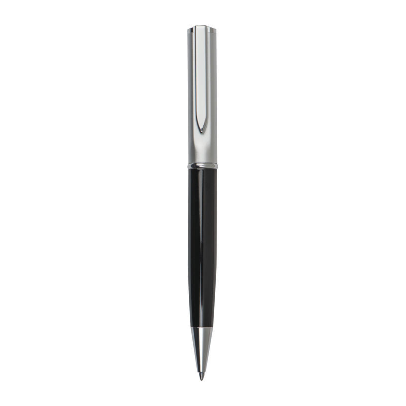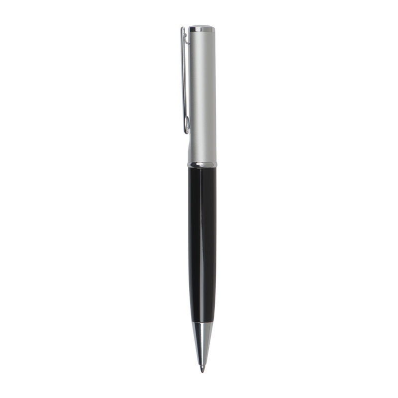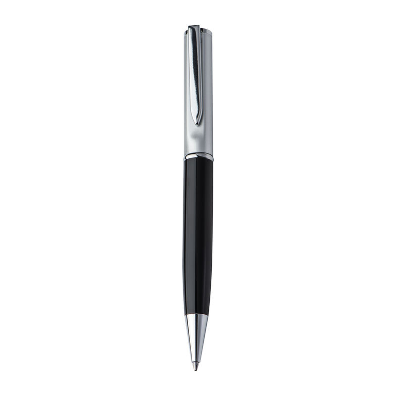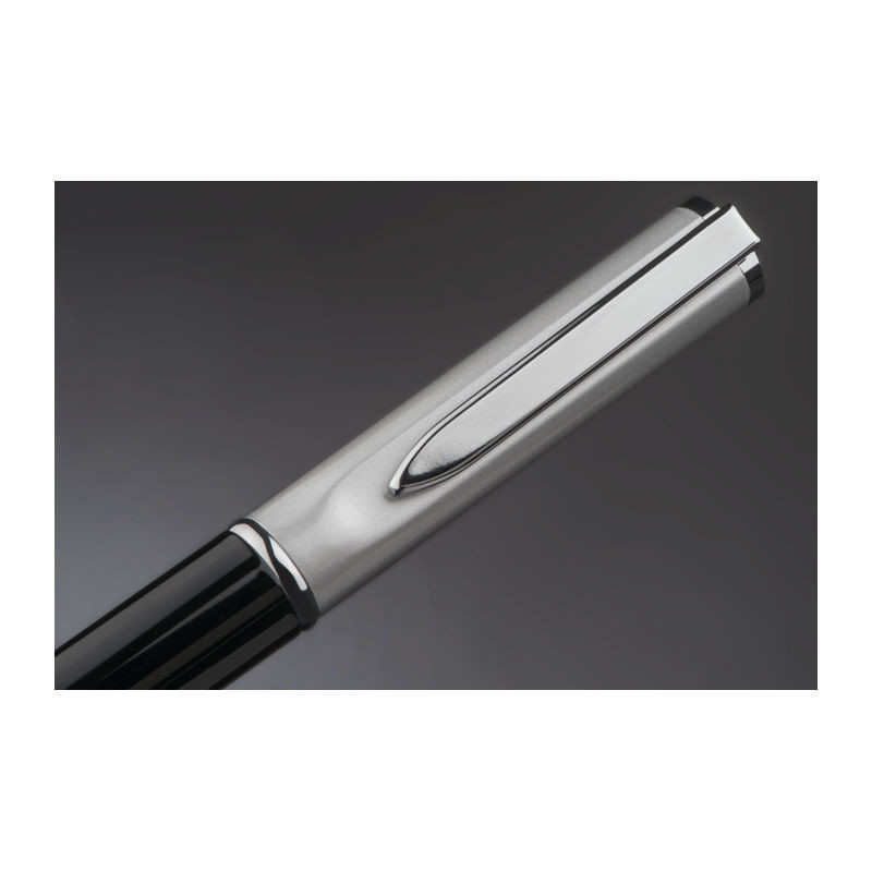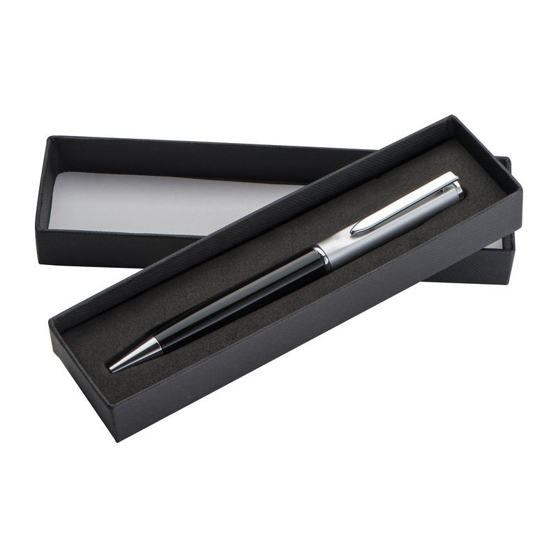 Elegáns fém golyóstoll ezüst felső résszel és kék tollbetéttel. A tollat papír díszdobozban szállítjuk.