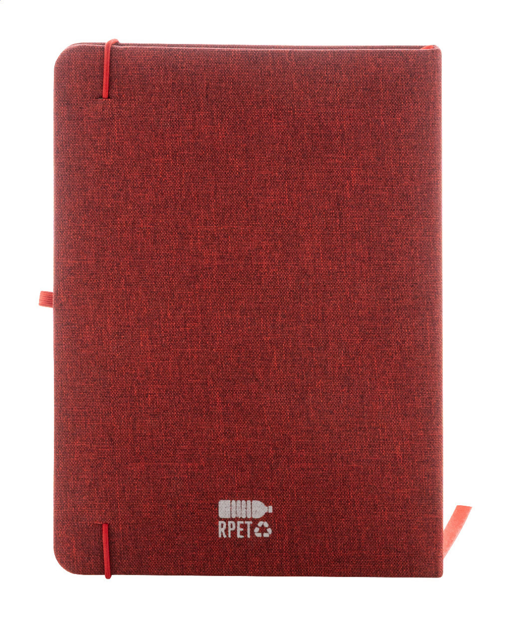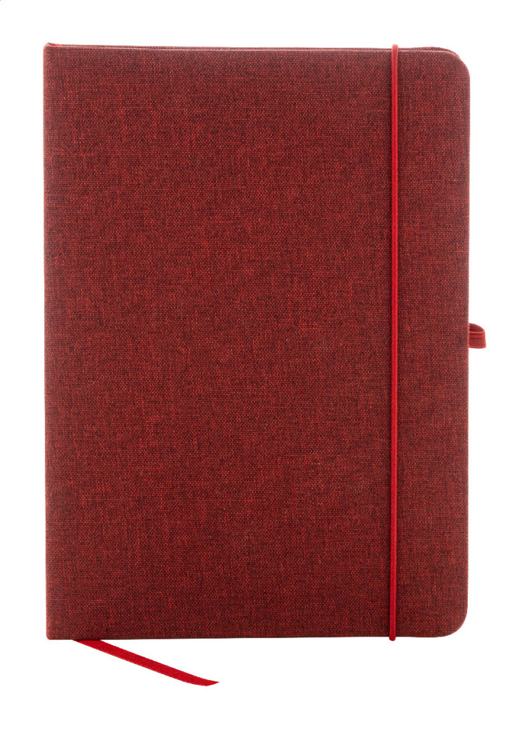 300D RPET poliészter borítású jegyzetfüzet 80 sima lappal. Hozzáillő színű gumipánttal, könyvjelzővel és tolltartóval. A5 méretű.