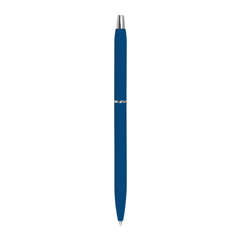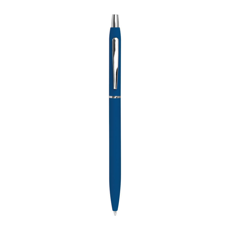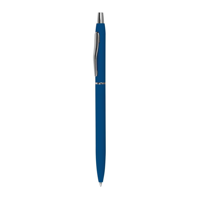 Vékony kivitelben készült nyomógombos, gumírozott fém golyóstoll, különböző színekben ezüst színű kiegészítőkkel és fekete betéttel.