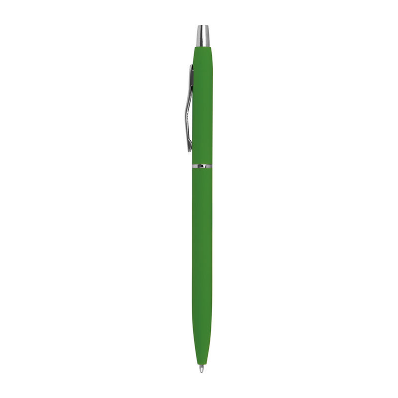 Vékony kivitelben készült nyomógombos, gumírozott fém golyóstoll, különböző színekben ezüst színű kiegészítőkkel és fekete betéttel.