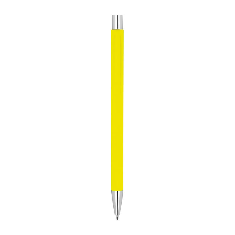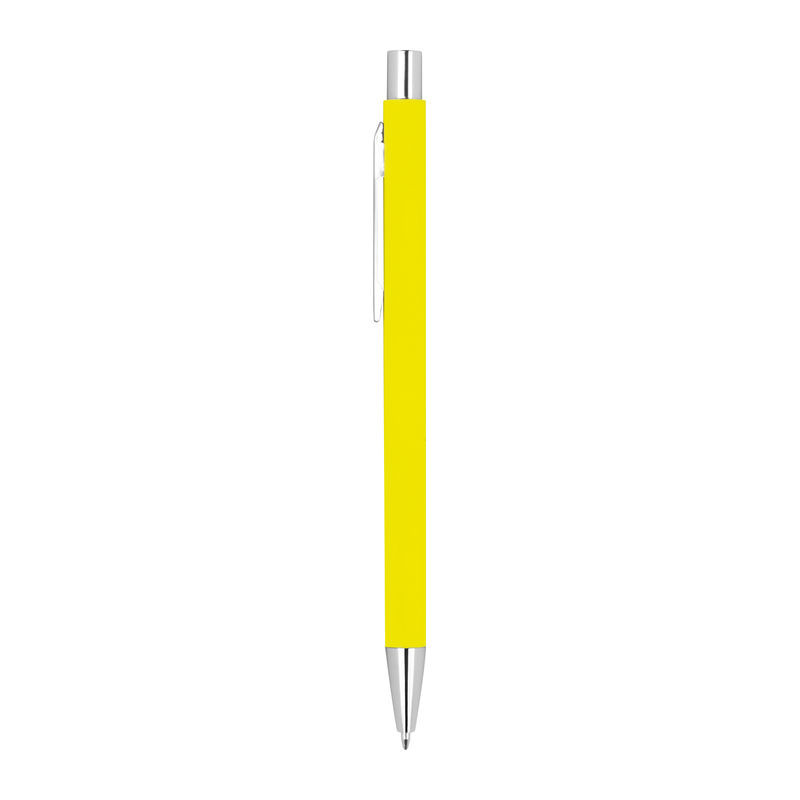 Vékony gumírozott fém nyomógombos golyóstoll ezüst színű kiegészítőkkel és kék színű tollbetéttel.