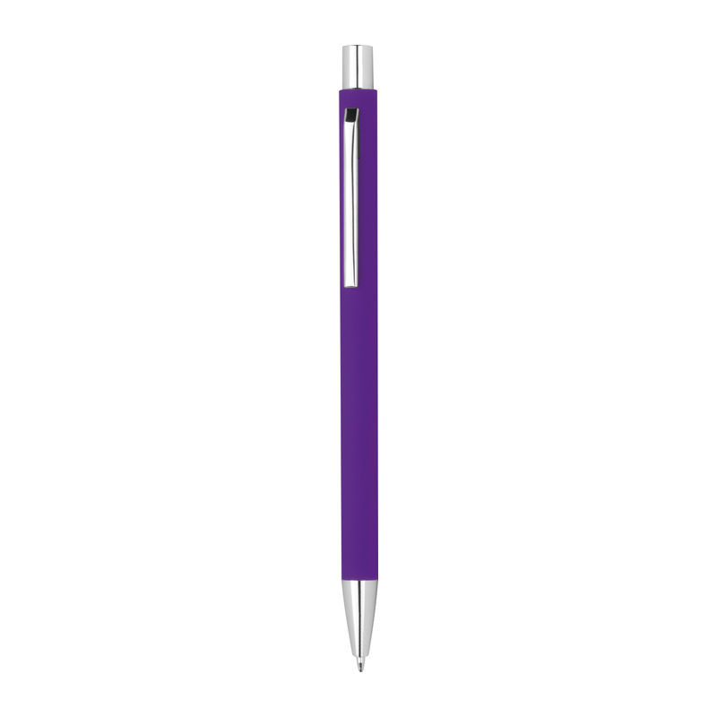 Vékony gumírozott fém nyomógombos golyóstoll ezüst színű kiegészítőkkel és kék színű tollbetéttel.