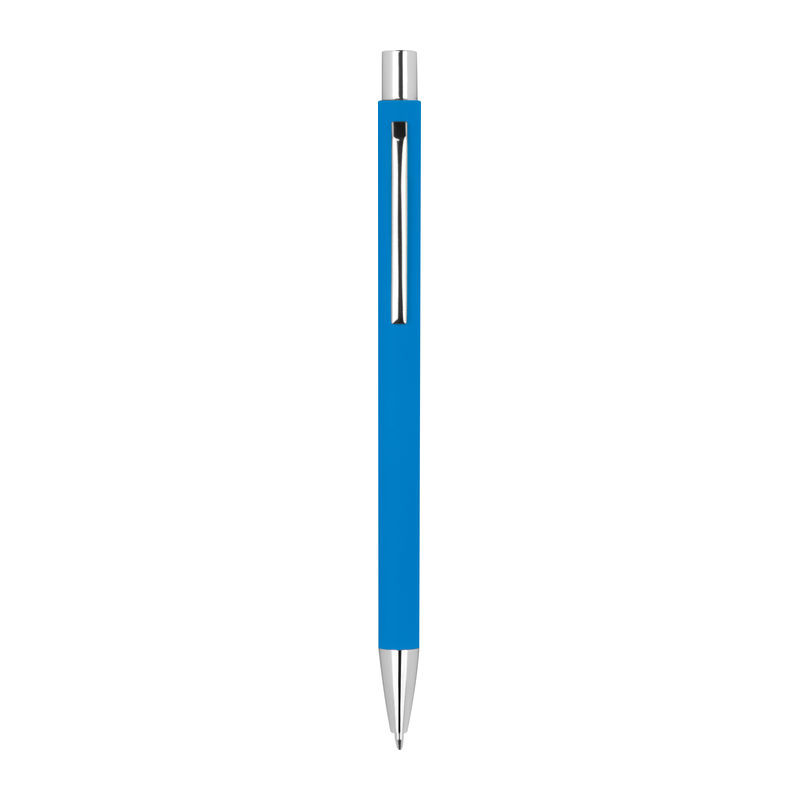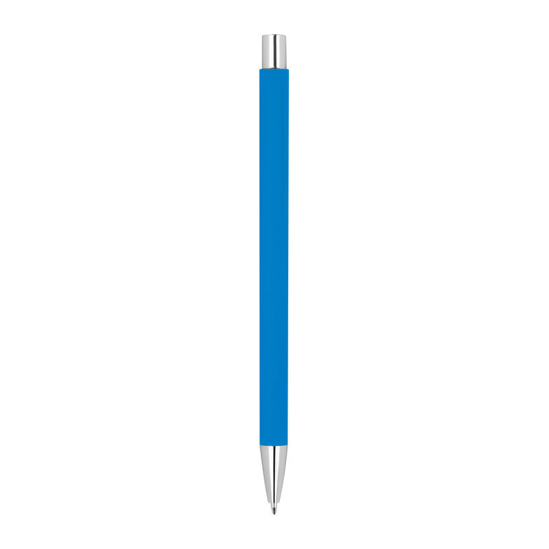 Vékony gumírozott fém nyomógombos golyóstoll ezüst színű kiegészítőkkel és kék színű tollbetéttel.