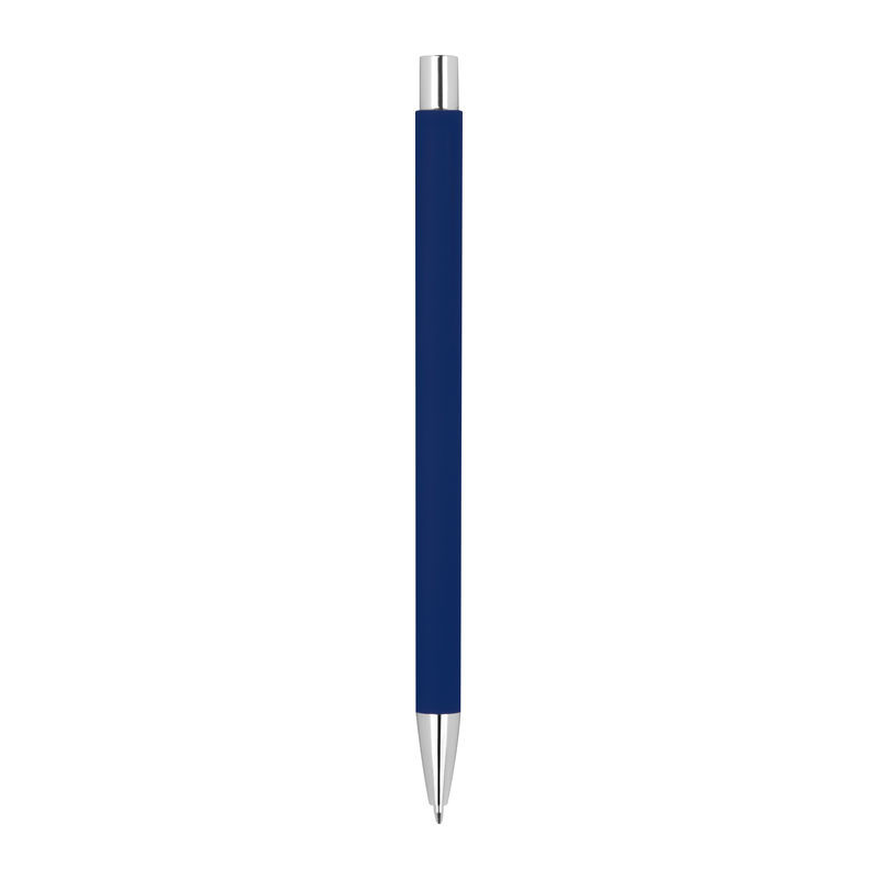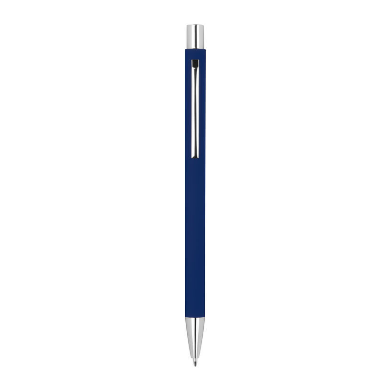 Vékony gumírozott fém nyomógombos golyóstoll ezüst színű kiegészítőkkel és kék színű tollbetéttel.