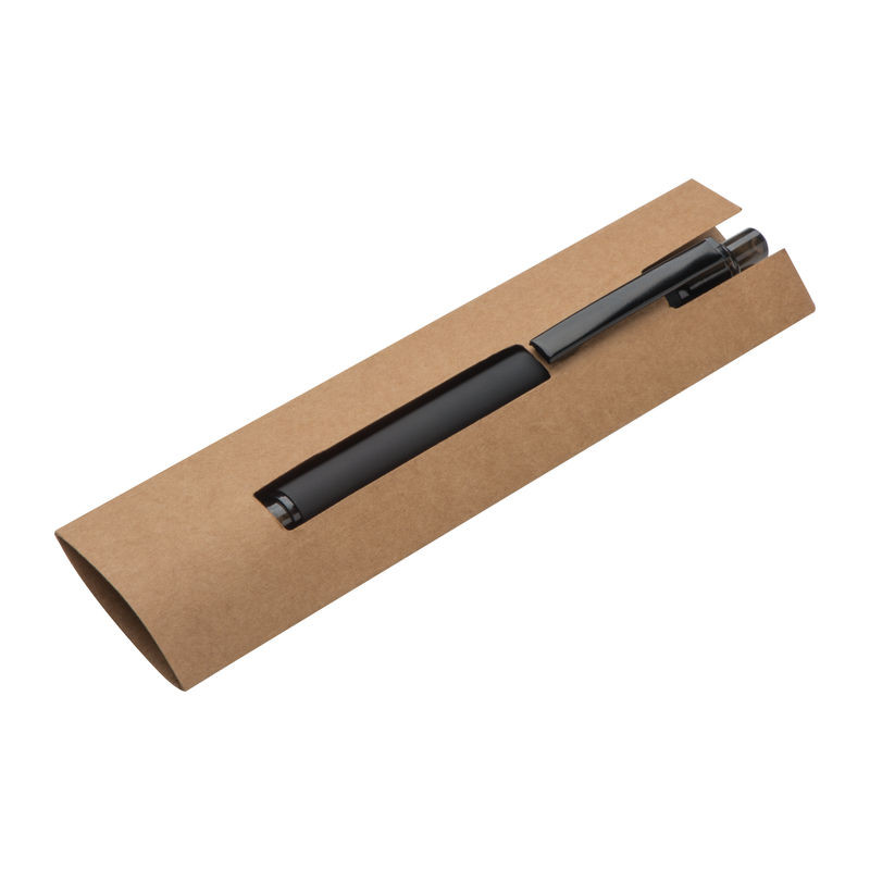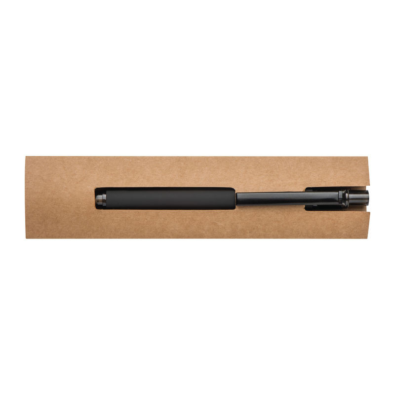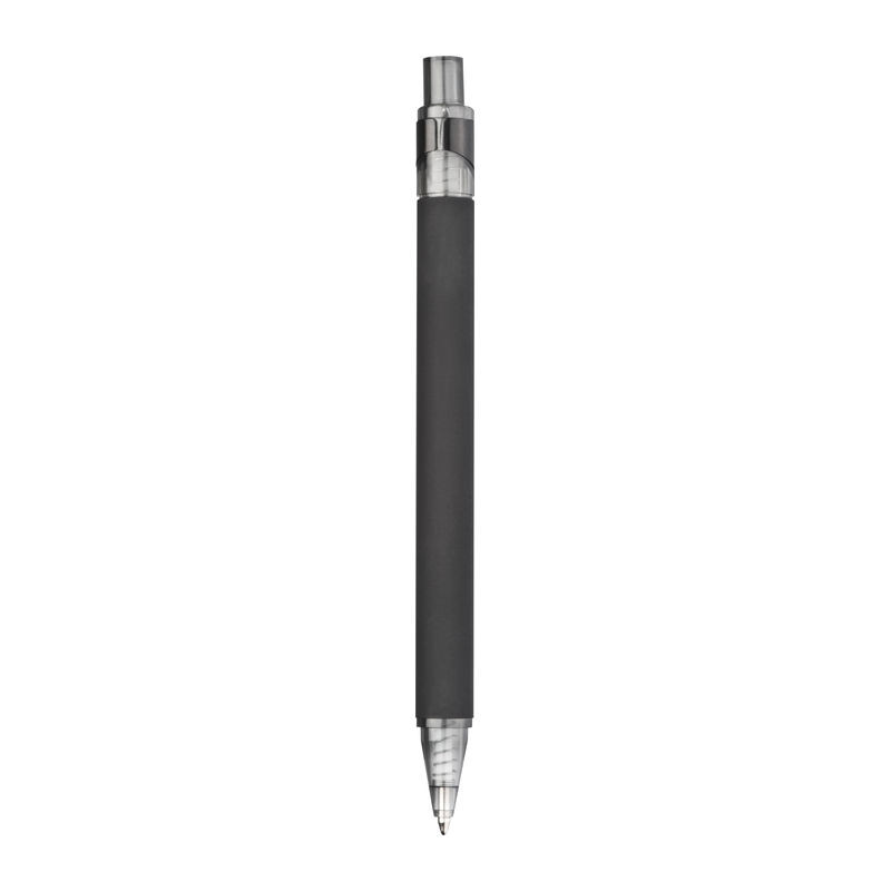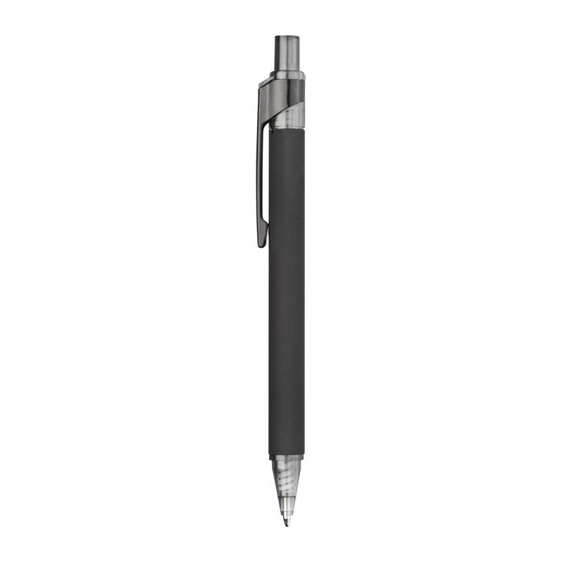 Matt fekete, gumírozott golyóstoll, kéken író nagy méretű betéttel és speciális, krómozott klippel.