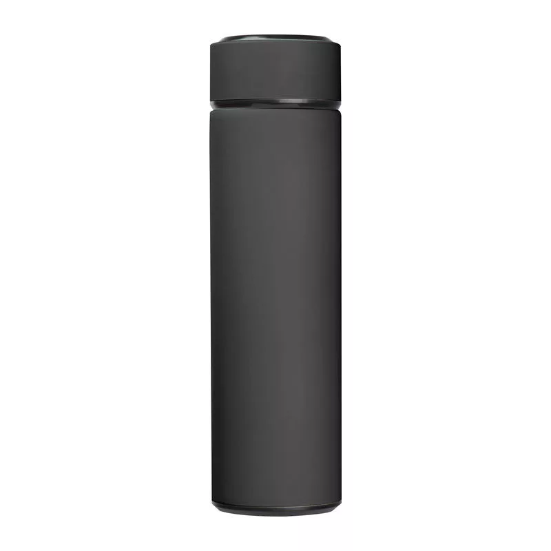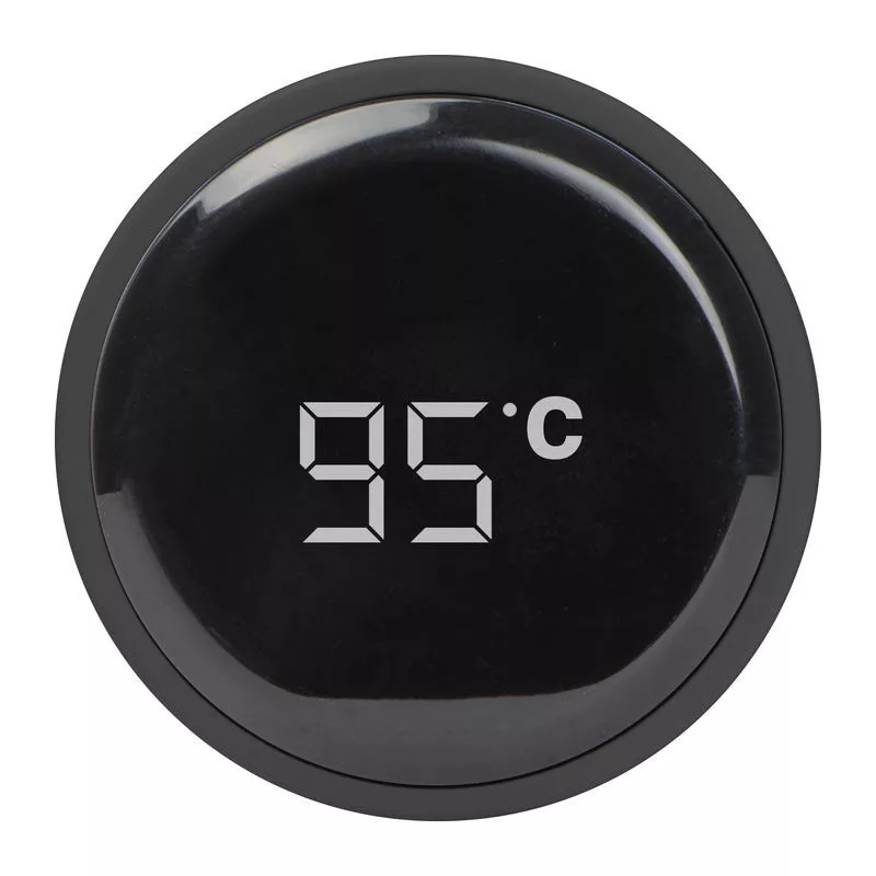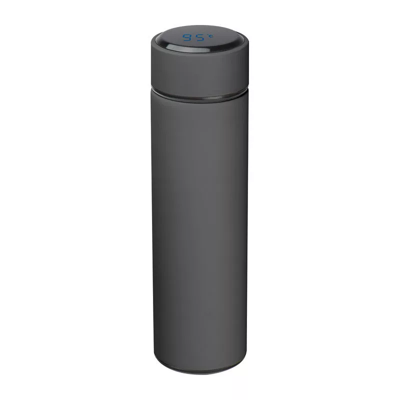 Rozsdamentes acélból készült duplafalú hőszigetelt vákuum ivópalack 450 ml űrtartalommal, hőmérővel, LED-es hőmérséklet kijelzővel a záró kupakjában, szivárgásmentes. Csak érintse meg, és megjelenik a hőmérséklet. Elemmel szállítjuk.