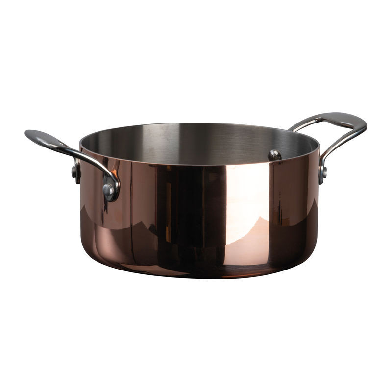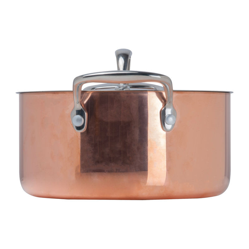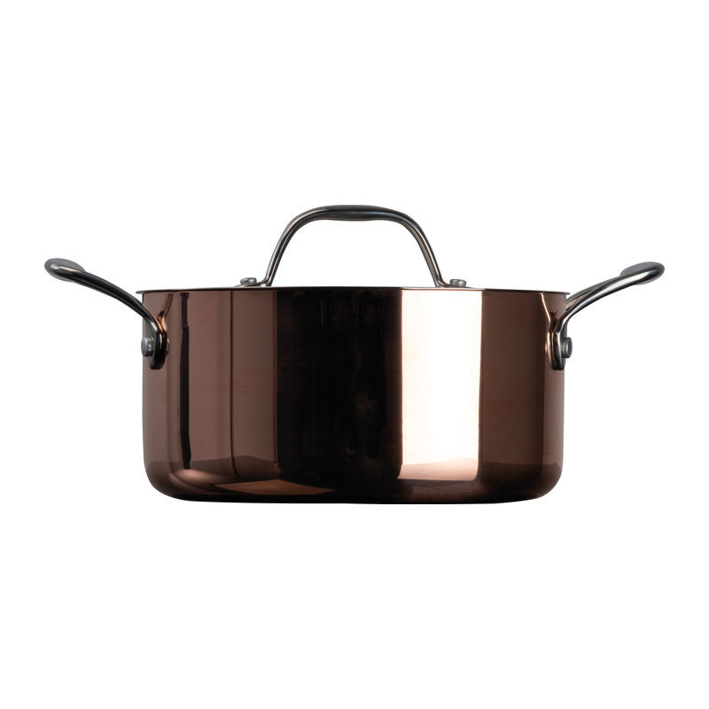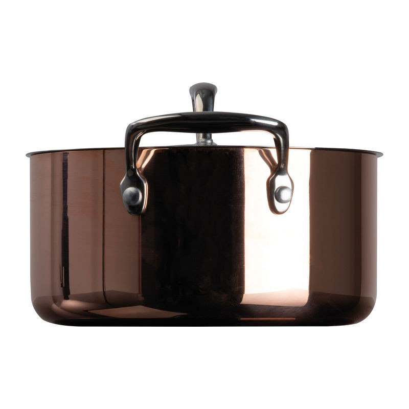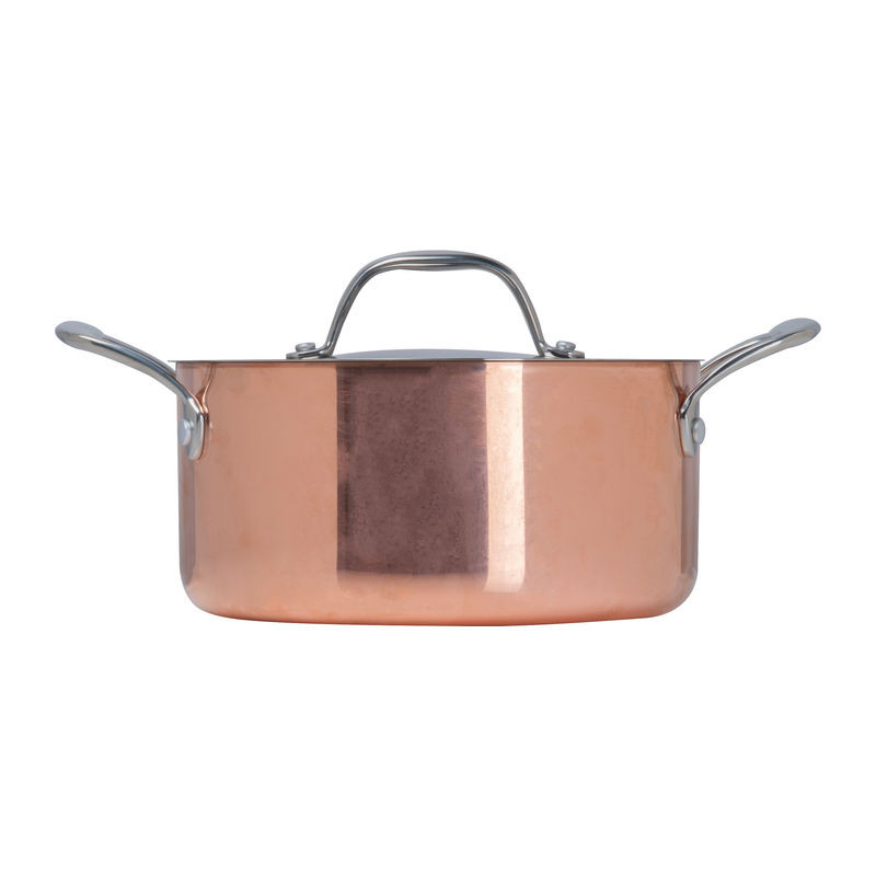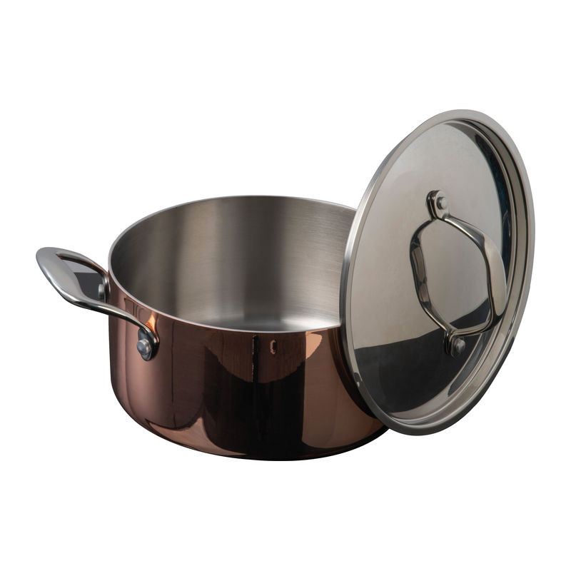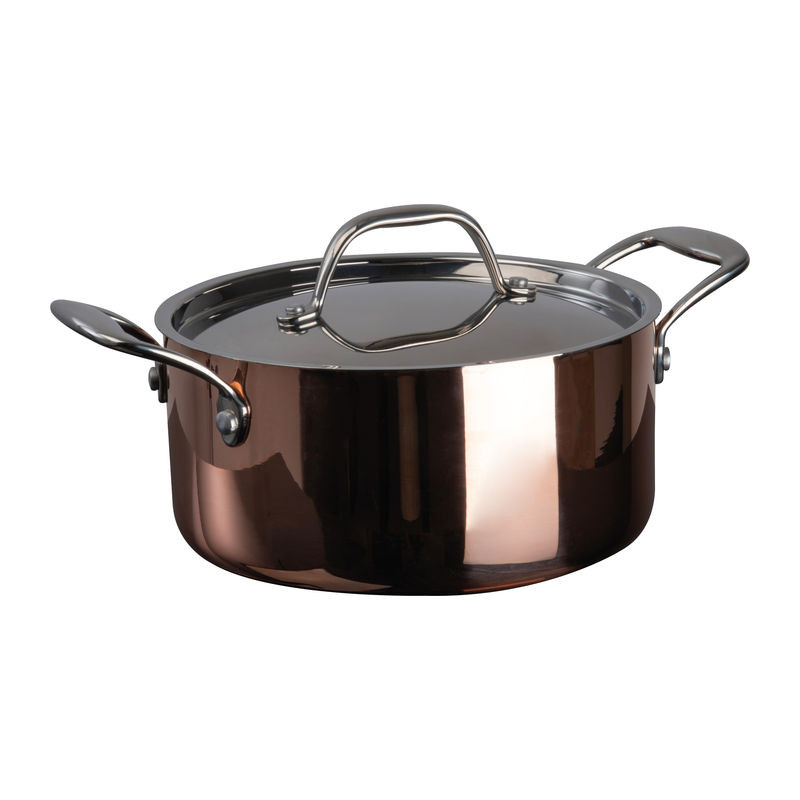 Rozsdamentes acélból készült főzőedény réz bevonattal és fedéllel, két fogantyúval. Alkalmas elektromos, gáz- és indukciós tűzhelyekhez. A réz bevonat biztosítja a legjobb hővezetést és hőtároló képességet.