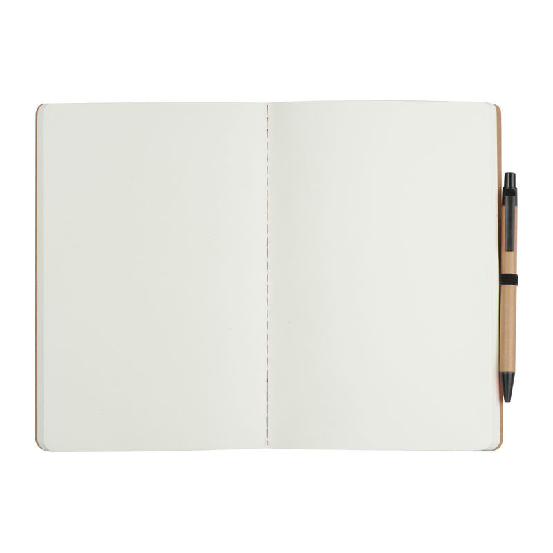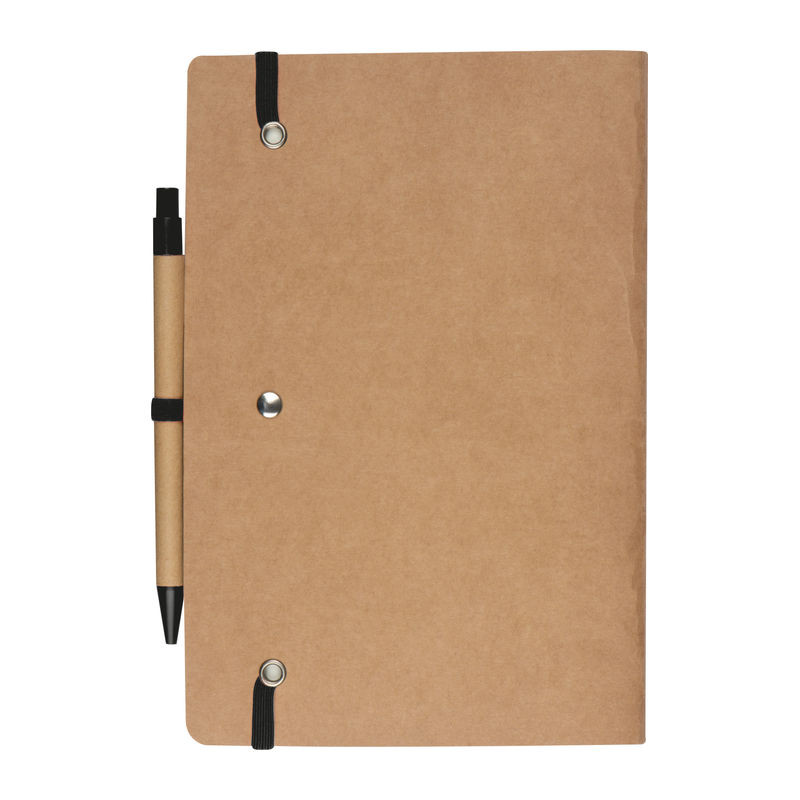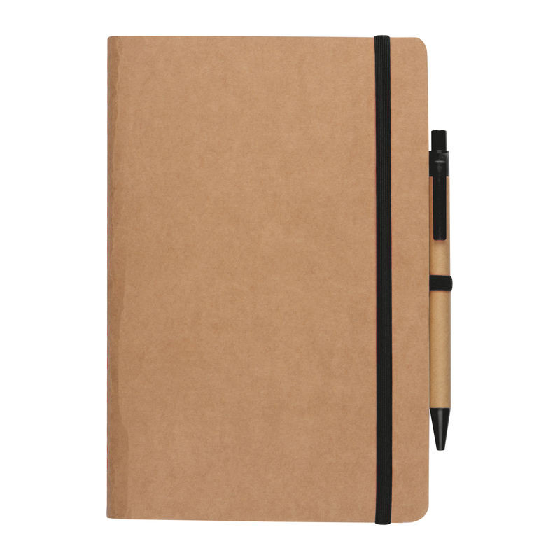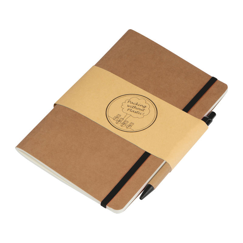 A5 notesz 120 újrahasznosított papírból készült oldallal, gumírozott pánttal, kéken író golyóstollal és tolltartó hurokkal.