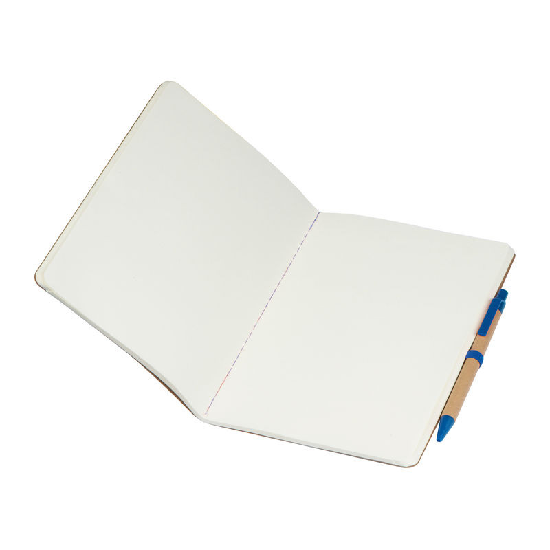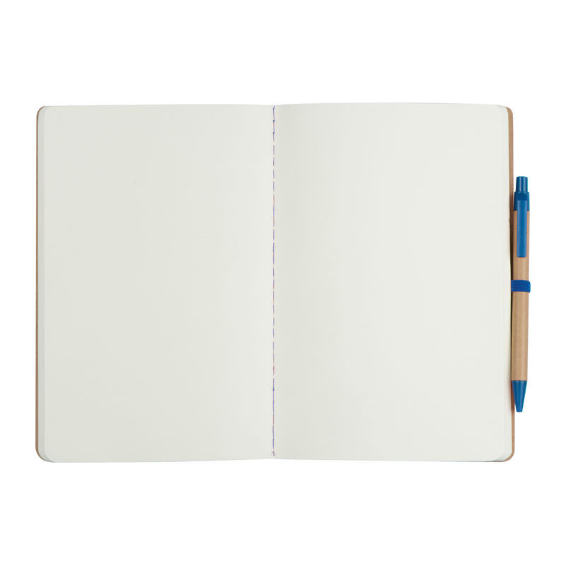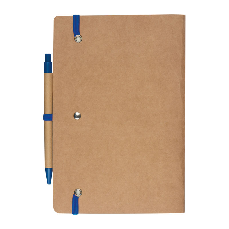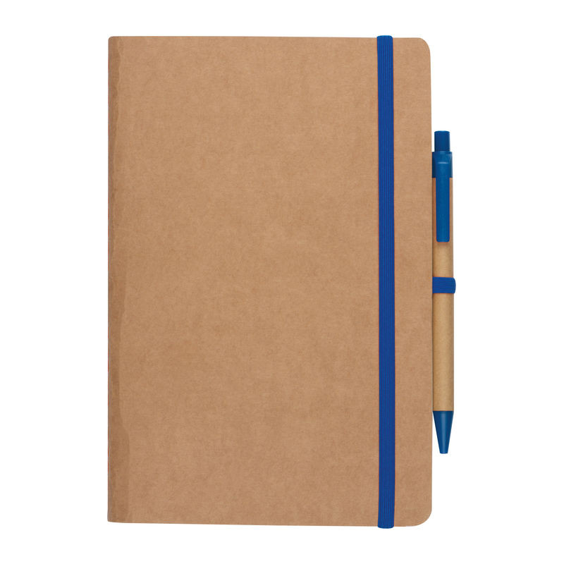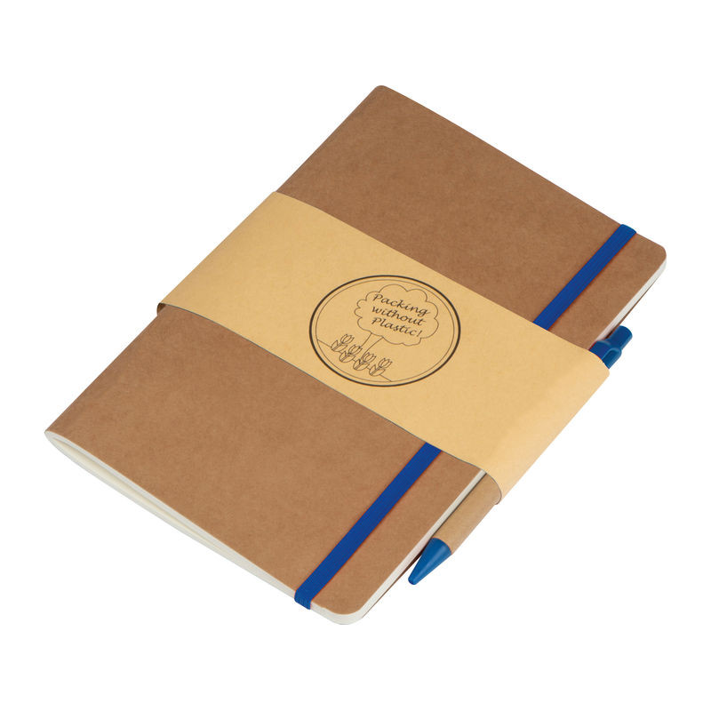 A5 notesz 120 újrahasznosított papírból készült oldallal, gumírozott pánttal, kéken író golyóstollal és tolltartó hurokkal.