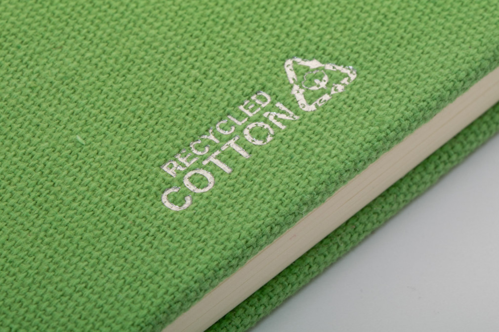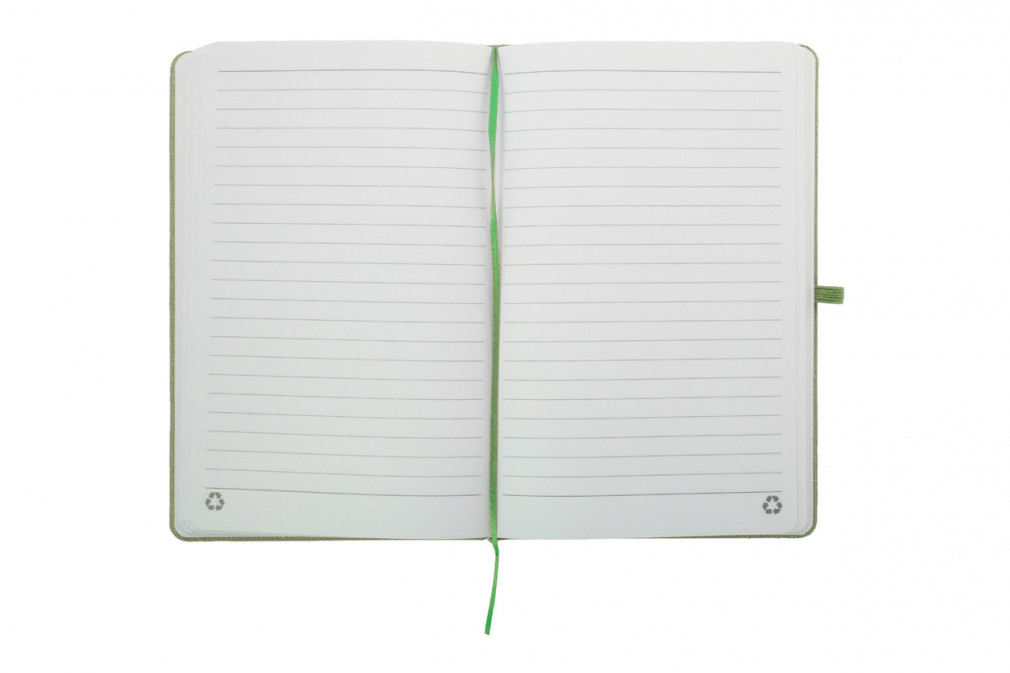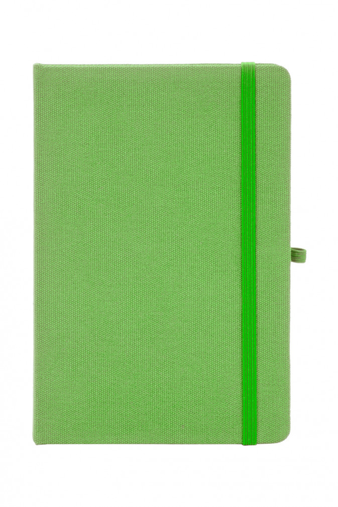 Újrahasznosított pamut borítású jegyzetfüzet 80 vonalas lappal, újrahasznosított papírból. Megegyező színű könyvjelzővel, gumiszalaggal és tolltartóval. A8 méretű.