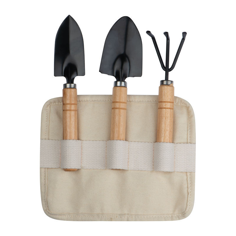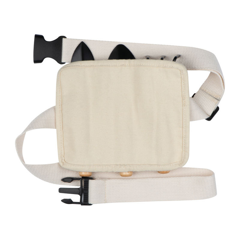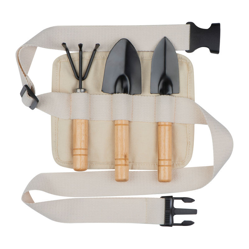 Praktikus kerti kisegítő készlet! Egy gereblyét és két különböző méretű lapátot tartalmaz vászon övre rögzítve.