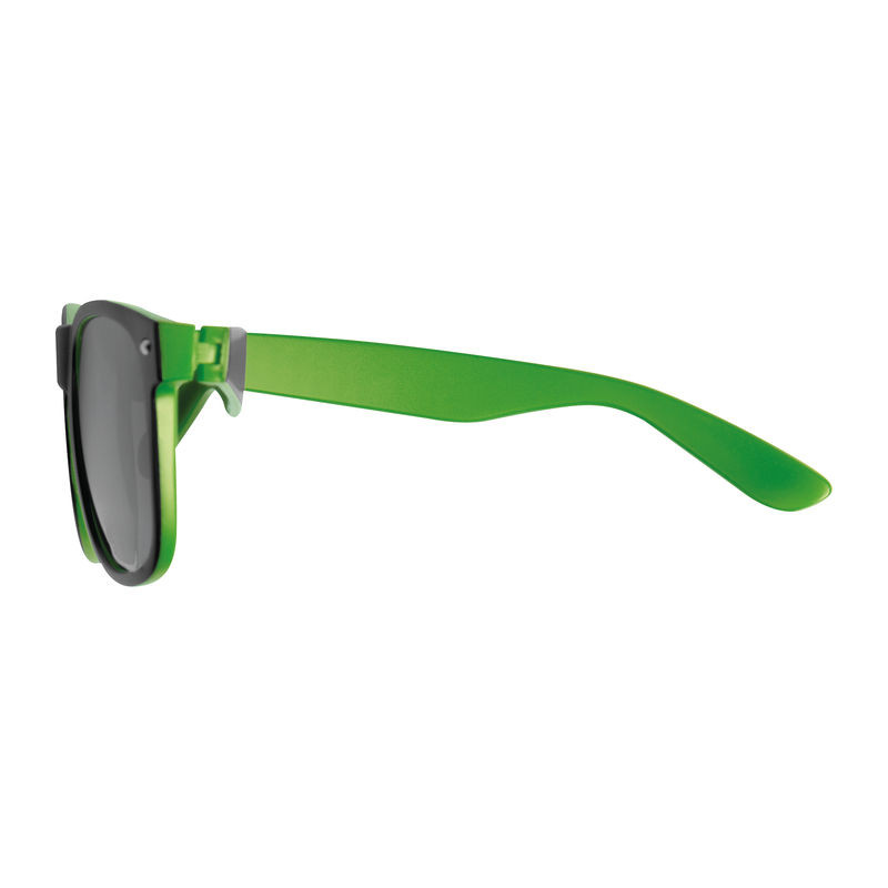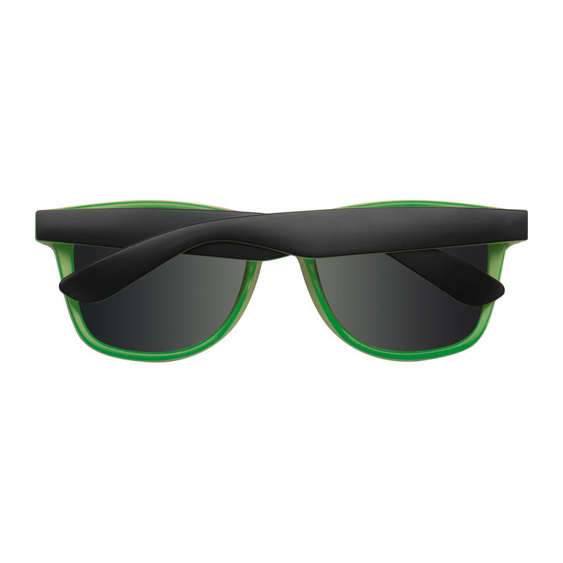 Stílusos műanyag napszemüveg, kétszínű kerettel és tükröződő lencsékkel, UV400 szűrővel, 3-as kategóriájú védelemmel.