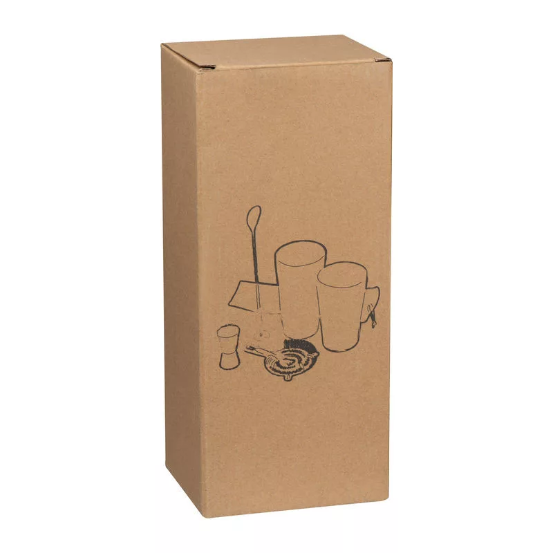 5 részes koktélkészlet, amely shakerből (750 ml), mérőpohárból (30 ml), szűrőből és keverőpálcából áll, velúr tasakban.