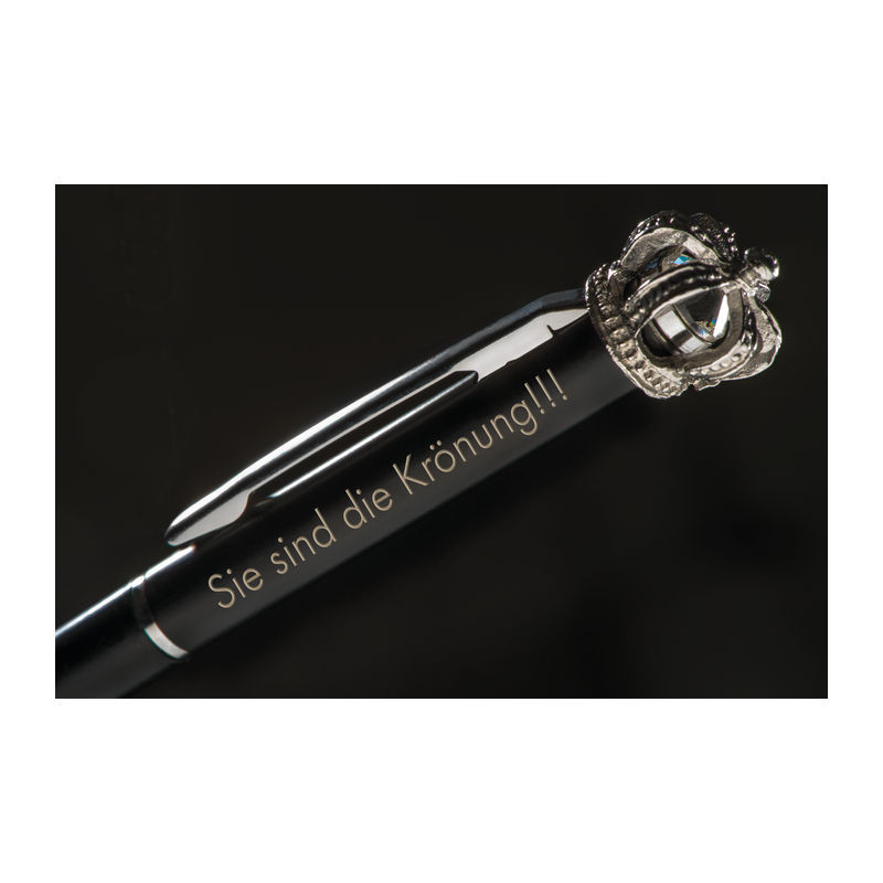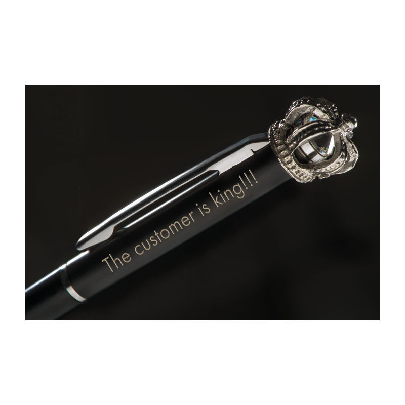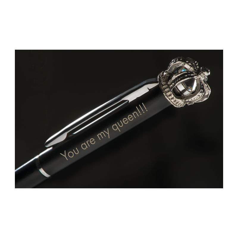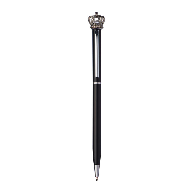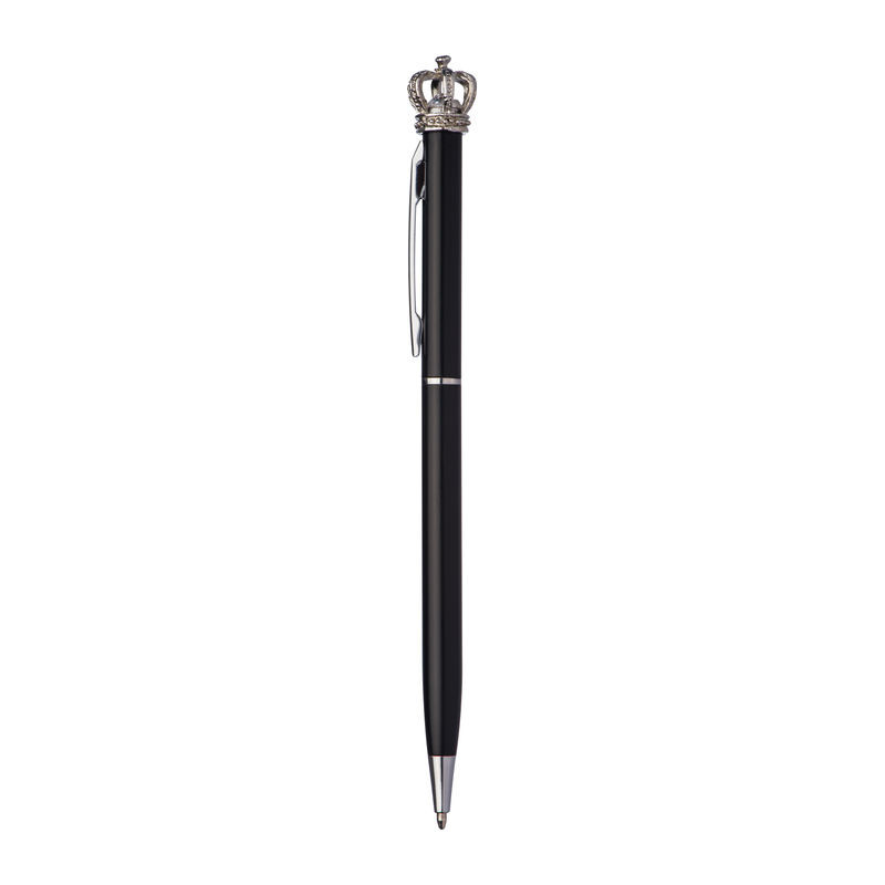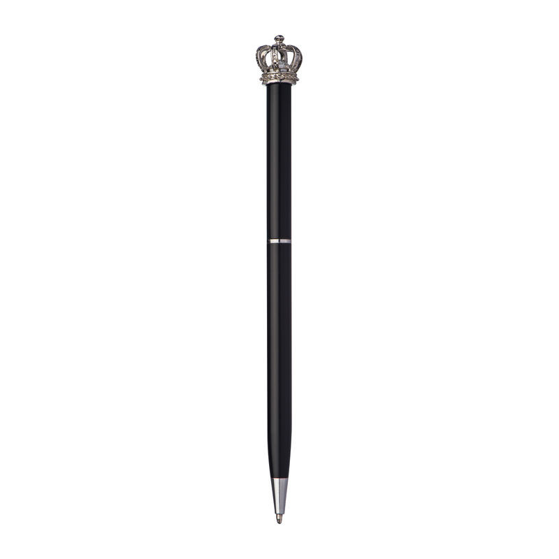 Vékony csavaró mechanikás fém golyóstoll, kék tollbetéttel. A korona díszítés és benne az eredeti Swarovski kő különlegessé teszi a tollat.