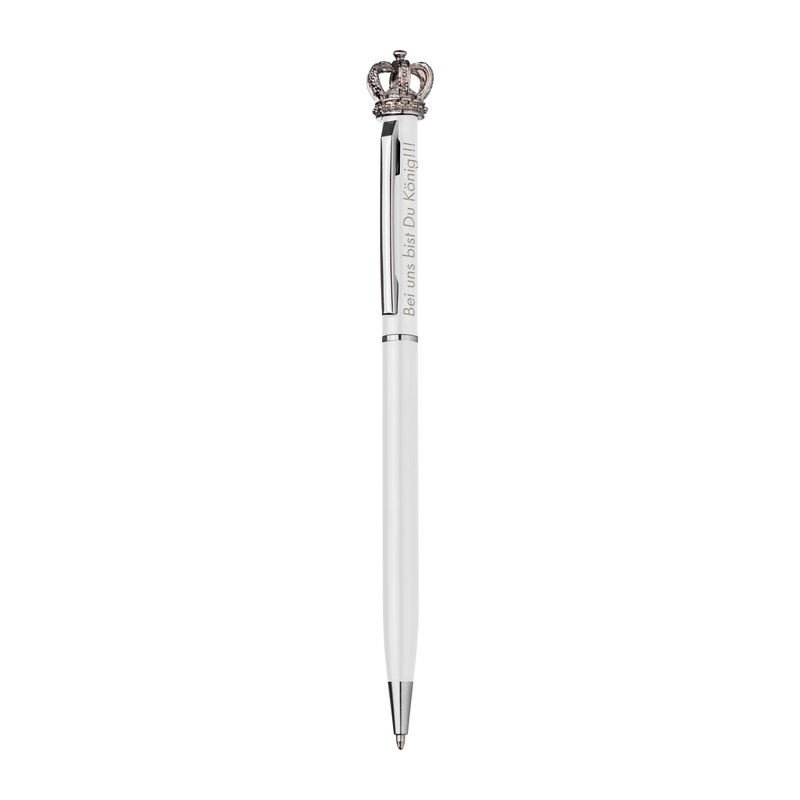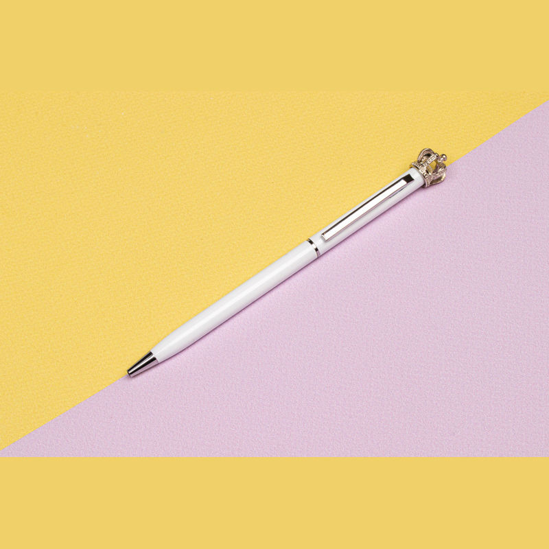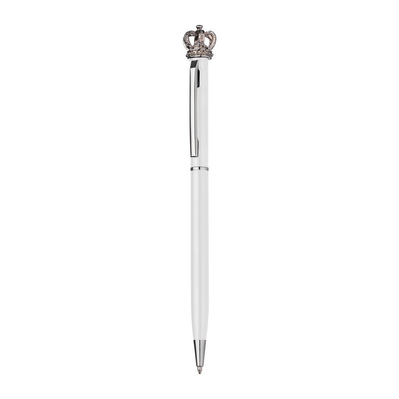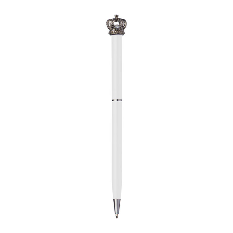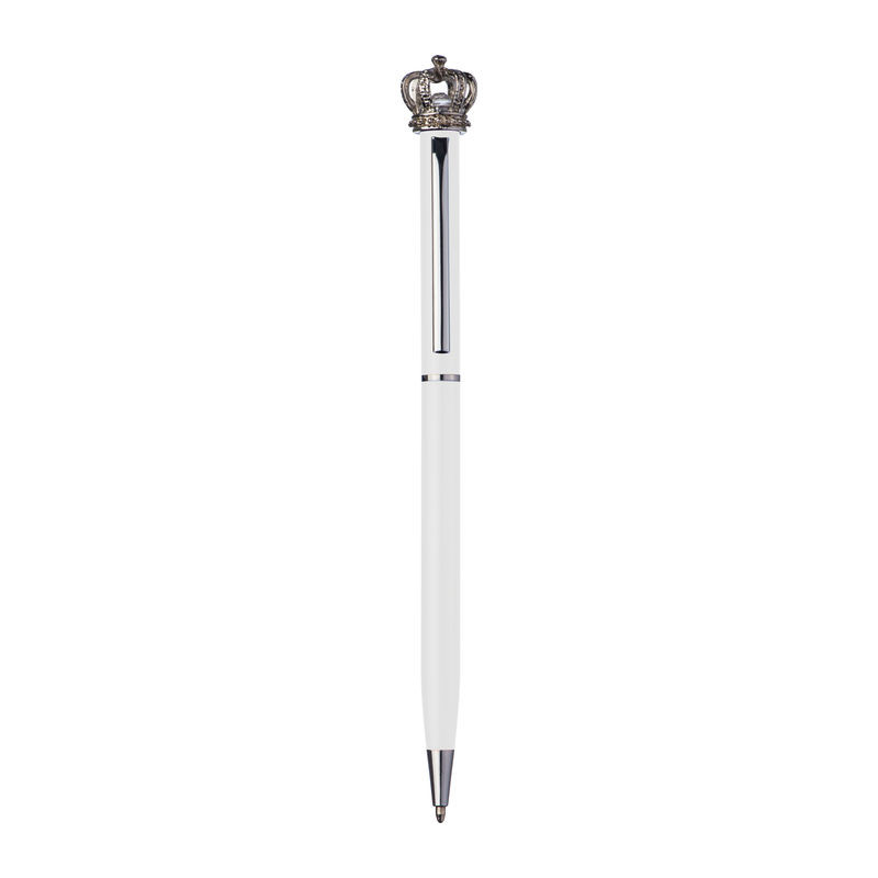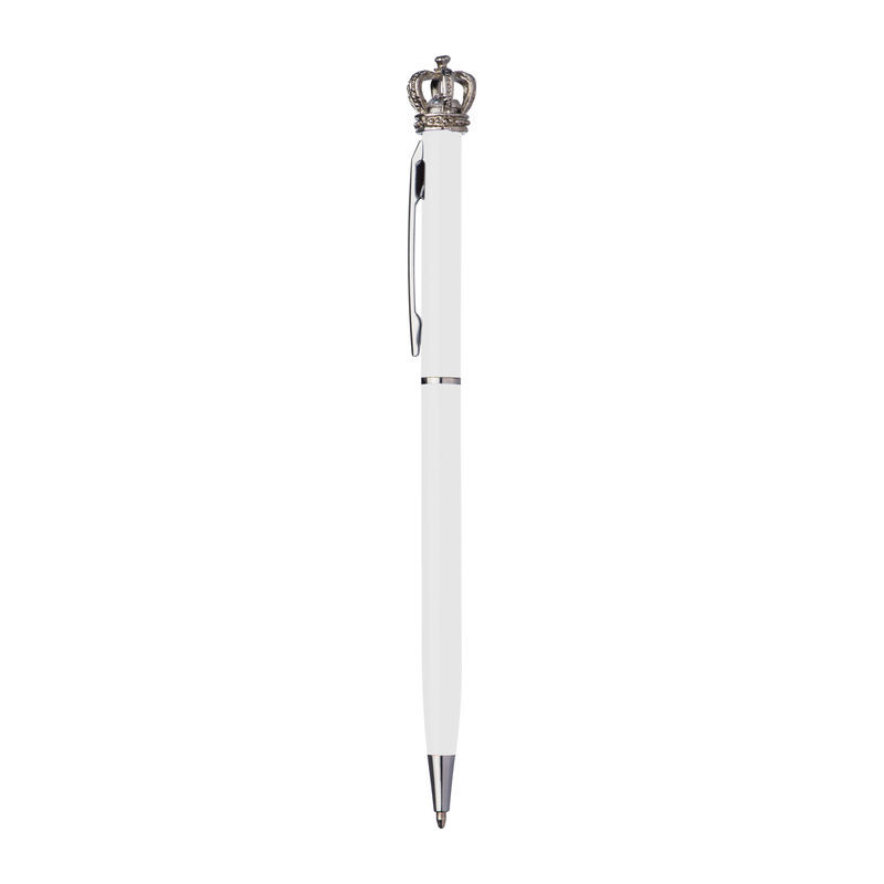 Vékony csavaró mechanikás fém golyóstoll, kék tollbetéttel. A korona díszítés és benne az eredeti Swarovski kő különlegessé teszi a tollat.