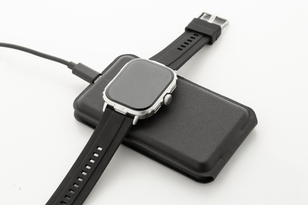 Luxus, összecsukható mobiltelefon-tartó és vezeték nélküli töltő szett újrahasznosított PU bőrből. Mágneses vezeték nélküli gyorstöltővel (15W), vezeték nélküli töltővel (5W) fülhallgatókhoz (csak Apple®) és vezeték nélküli töltővel (2,5W) okosórákhoz (Apple® és Samsung®). Öntapadó fémgyűrűvel, amellyel bármilyen vezeték nélkül tölthető eszközön használhatja a mágneses funkcióját. Kompatibilis az iPhone® 12 vagy újabb készülékkel. USB töltőkábellel.