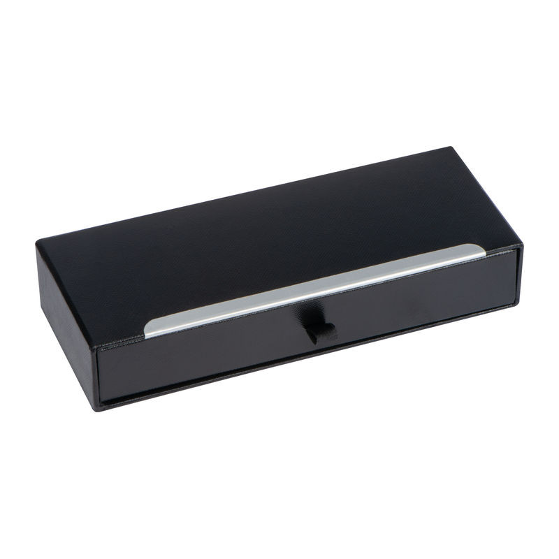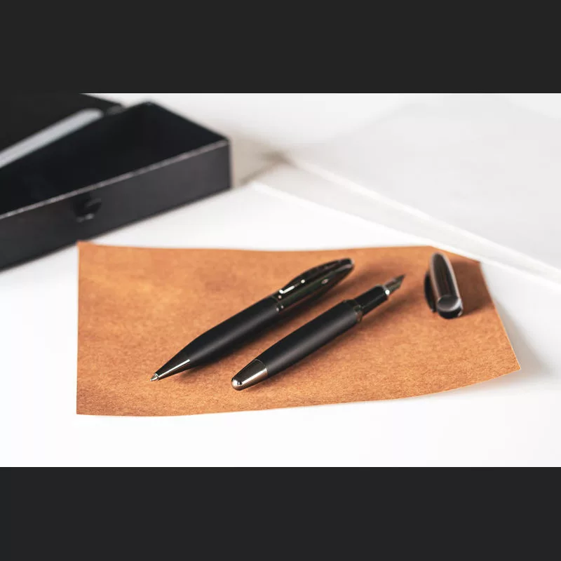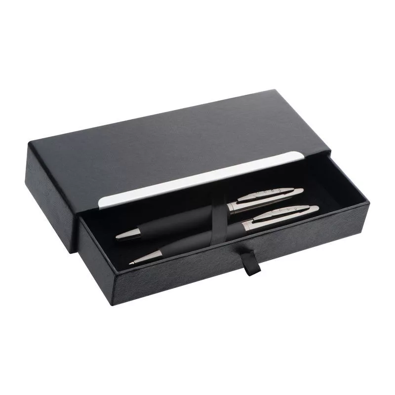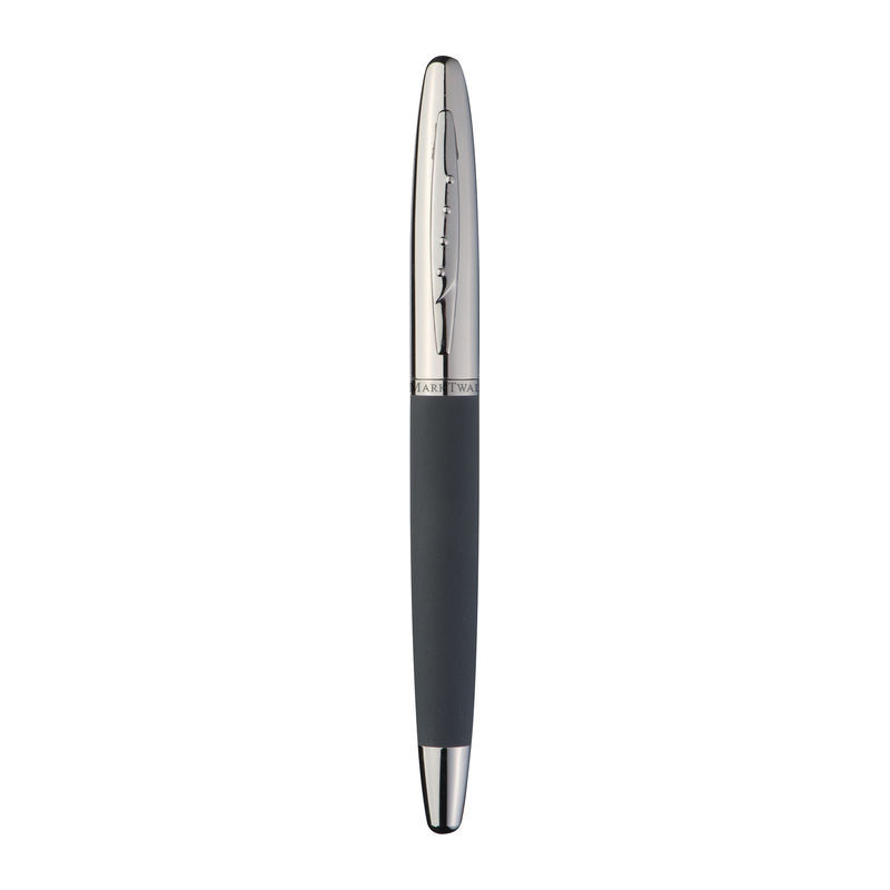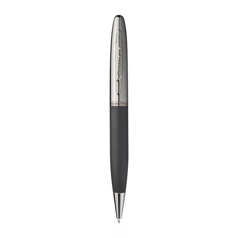 Mark Twain toll szett kihúzható fekete tokban. A csomag tartalma egy csavaró mechanikás, kék betétes golyóstoll és egy gumimarkolatos töltőtoll.