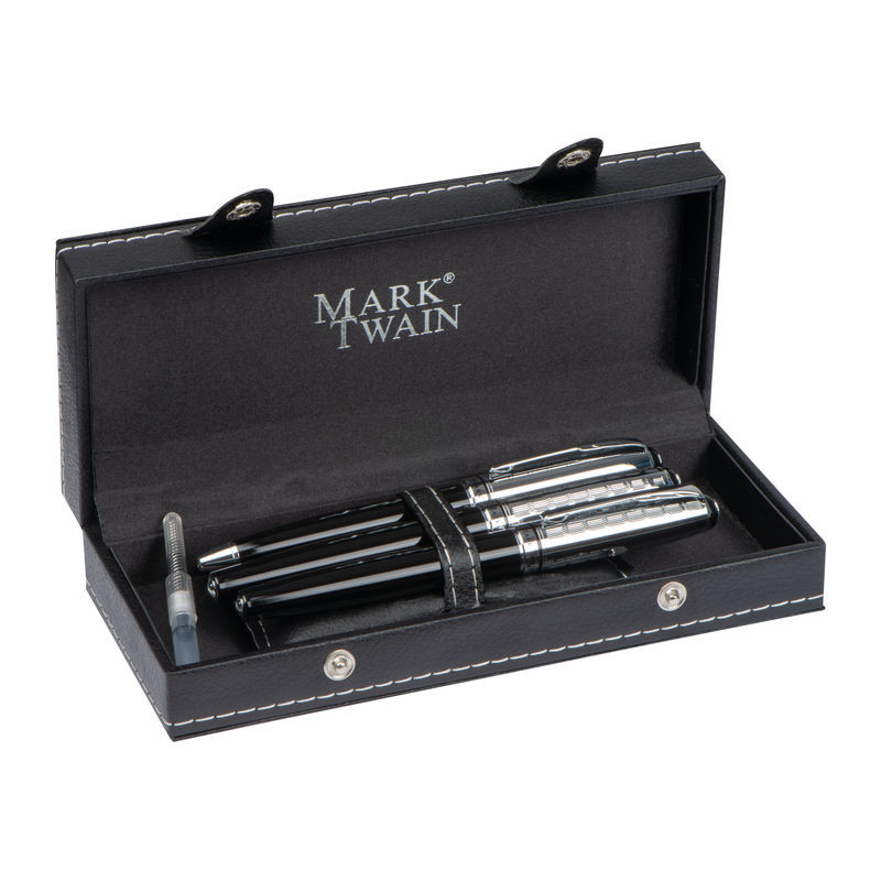 Mark Twain 3 db-os toll szett. Tartalma: egy töltőtoll újratölthető betéttel, egy kéken író golyóstoll és egy rollertoll. A készlet elegáns, fehér varrással ellátott dobozban érkezik.