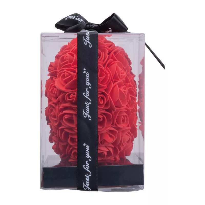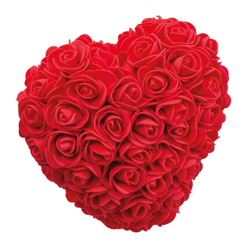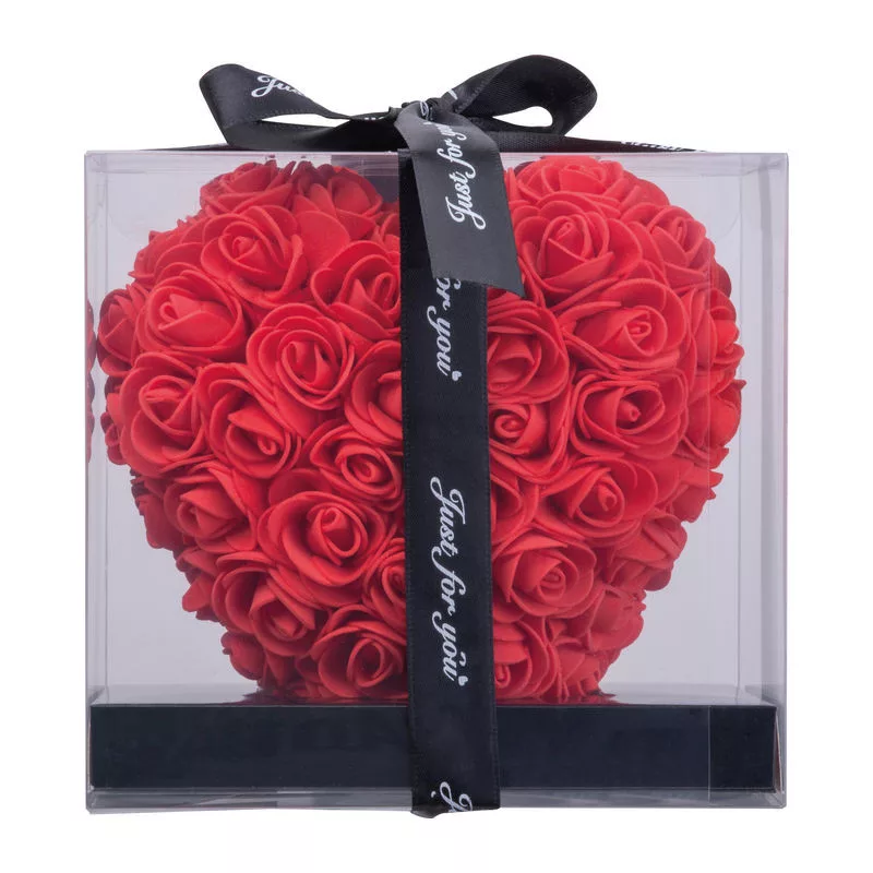 Szív forma valósághű mű rózsafejekből. Művirág, átlátszó, minőségi ajándékdobozban, elegáns szalaggal átkötve, dekorációs ajándéknak vagy kedves gesztusnak.