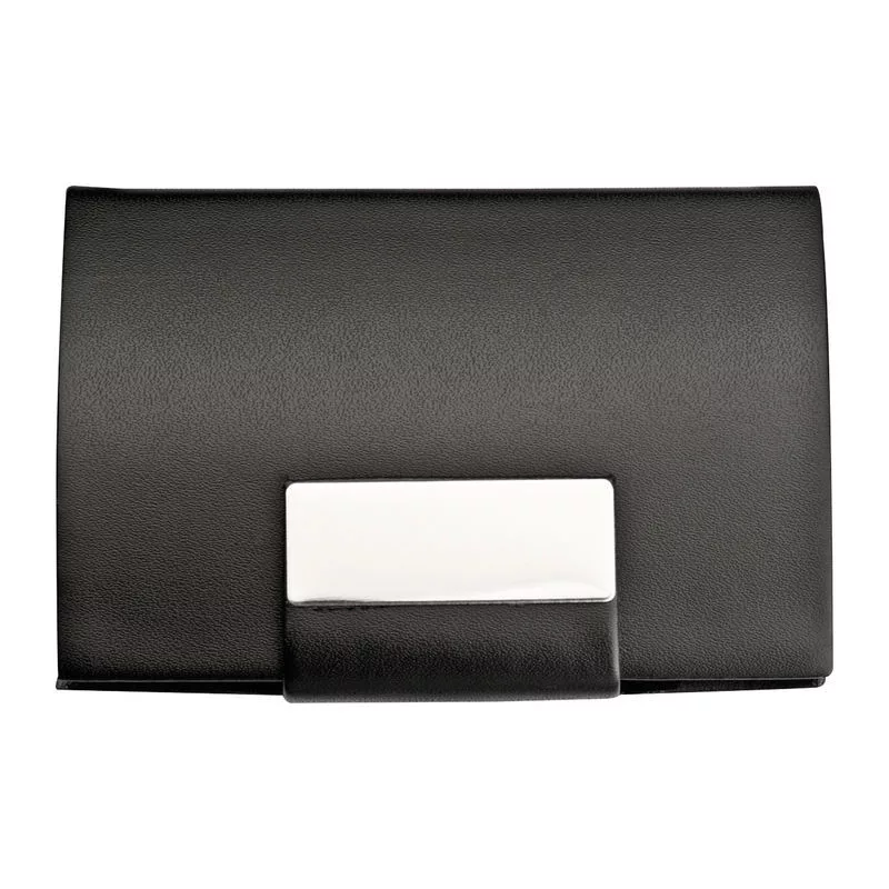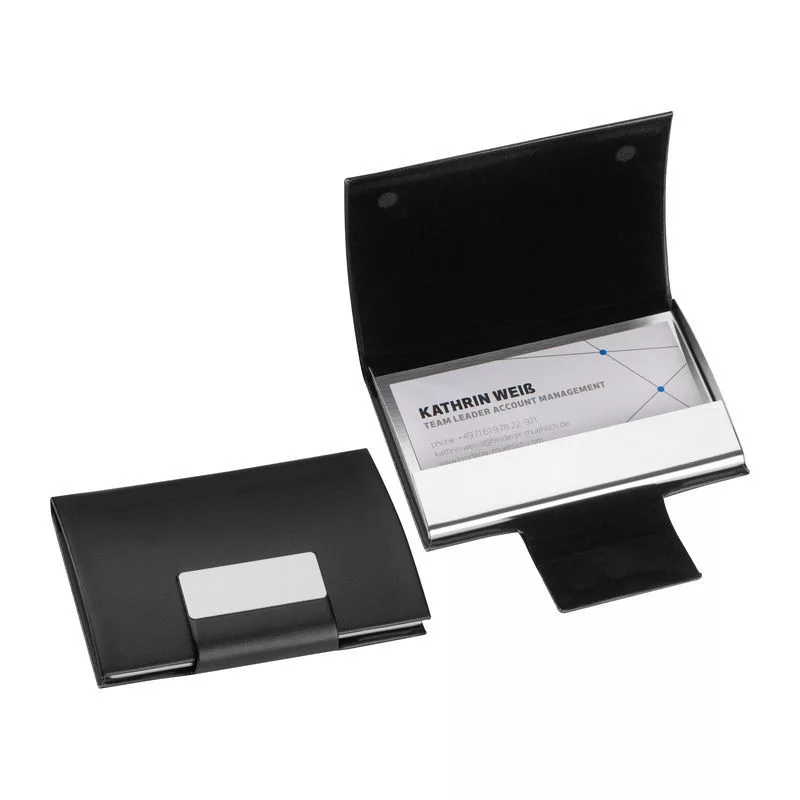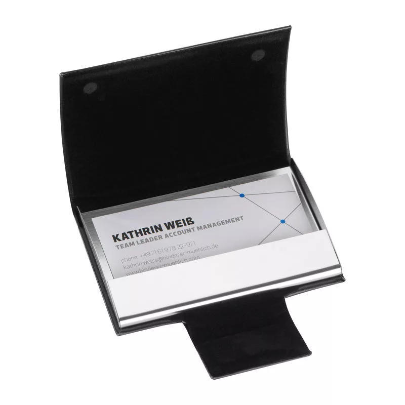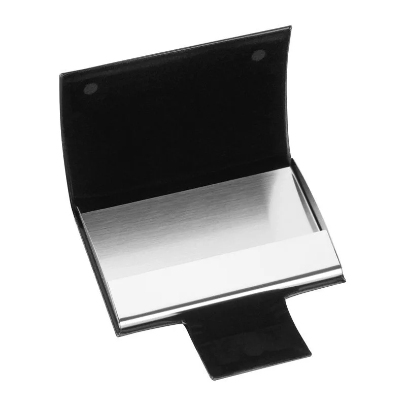Névjegykártyatartó a névjegykártyák megfelelő tárolására. A tartó jó minőségű műbőr borítással és mágneszárral készült.