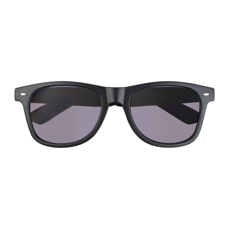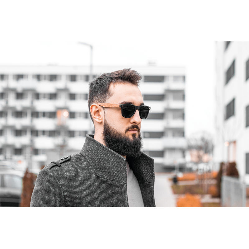 Fekete, klasszikus napszemüveg UV 400-as védelemmel, 3-as szűrőkategóriával, kiváló minőségű műanyag kerettel és parafával díszített szárral.