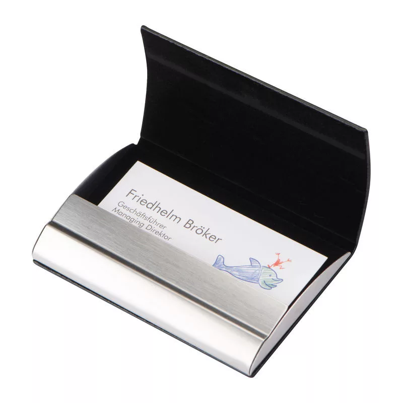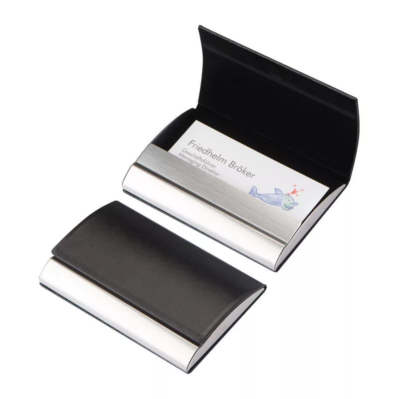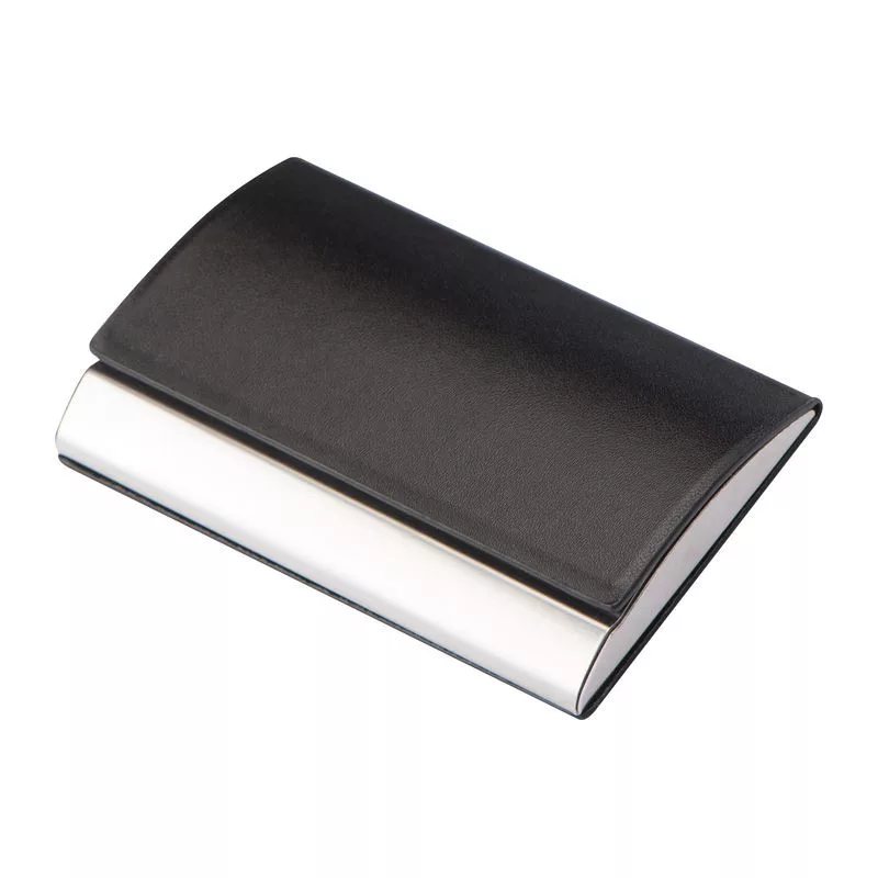 Elegáns névjegykártyatartó fémből, műbőr borítással és mágneses zárral ellátva.