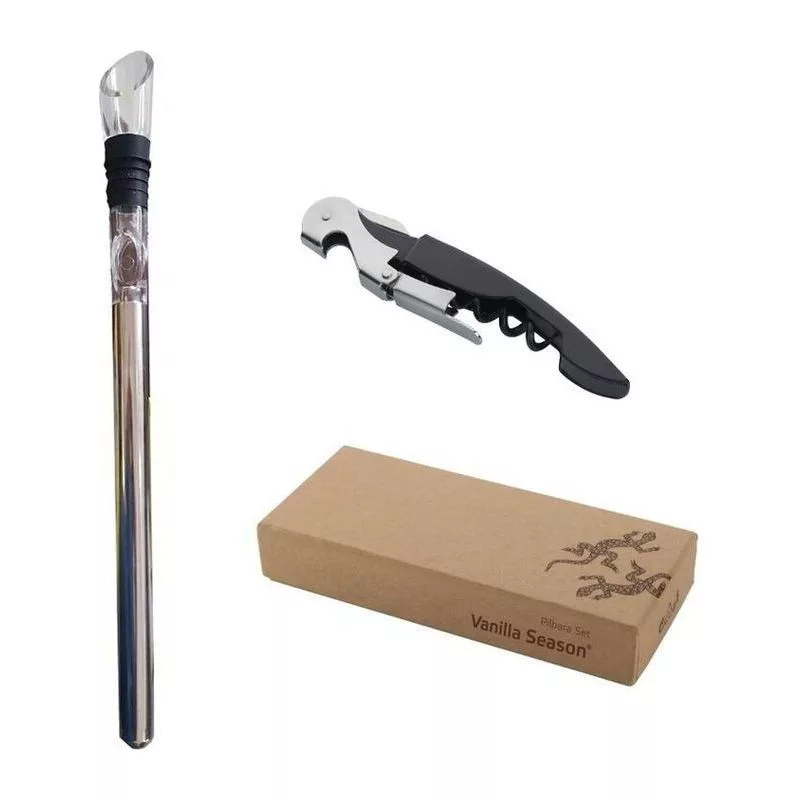 A romantikus pillanatok értékes része lehet ez a borozáshoz való készlet. A készlet egy dugóhúzót és egy kis tölcsérrel ellátott hűtőpálcát tartalmaz. A hűtőpálca megfelelő hőmérsékleten tartja a bort, amíg szükséges.