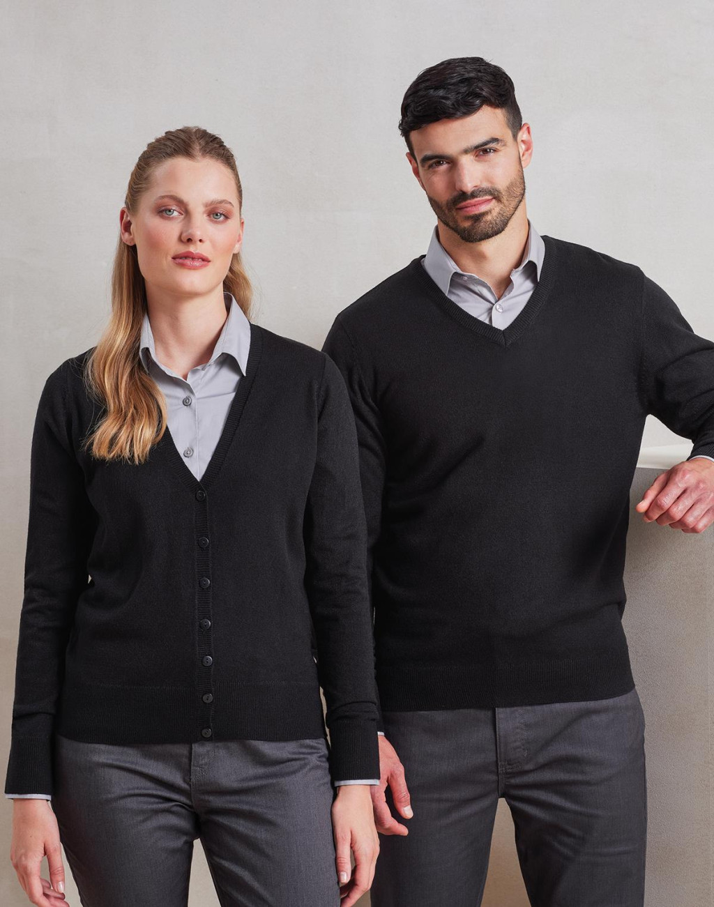Fabric 100% Acrylic 12 gauge knit Features Ribbed knit neck. hem. and cuffs Contemporary V-neck styling Fine knit Soft feel Easy care