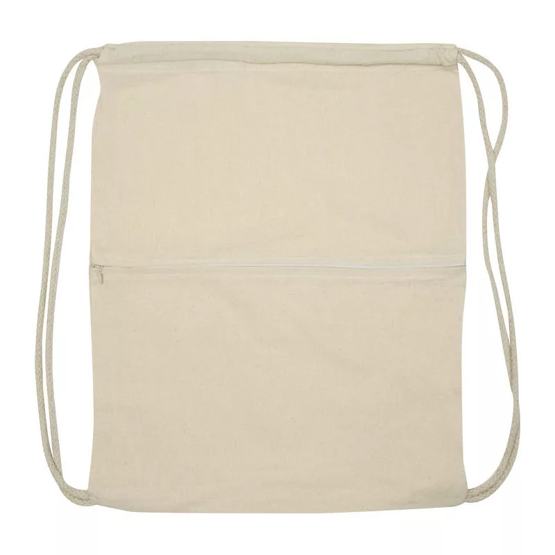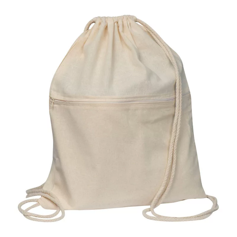 Oeko-Tex® STANDARD 100 minősítésű pamut tornazsák, 140g/m² anyagvastagságú környezetbarát, természetes színű pamutból, 2 zsinórral záródik, elöl cipzáras zsebbel.