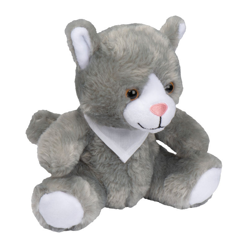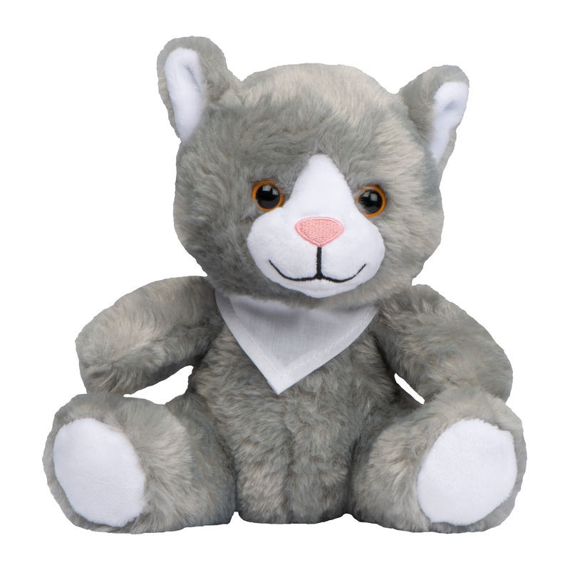 Bolyhos plüss cica ülő helyzetben, kendővel. Hűséges társ a gyermekek számára.