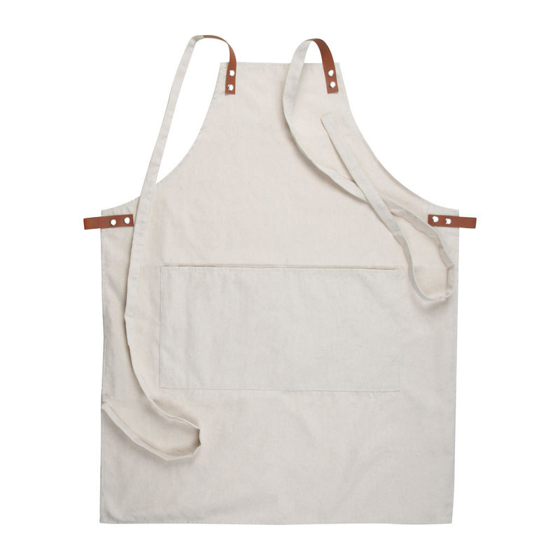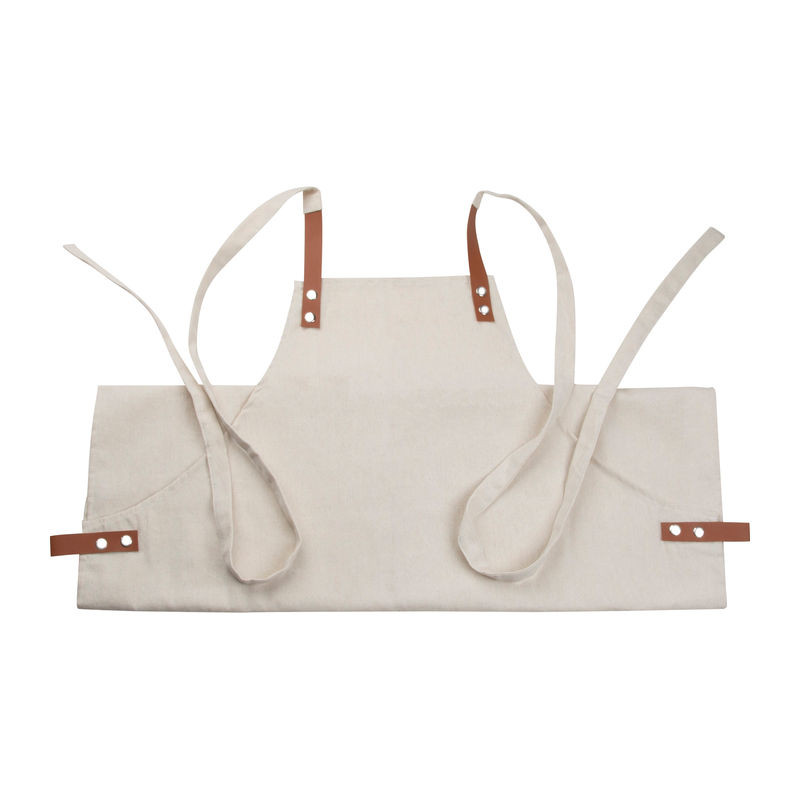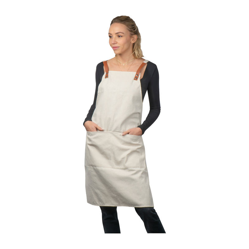 340g-os Oeko-Tex pamutból készült elegáns kötény, két elülső zsebbel és kontrasztos színű PU-ból készült állítható pántokkal.