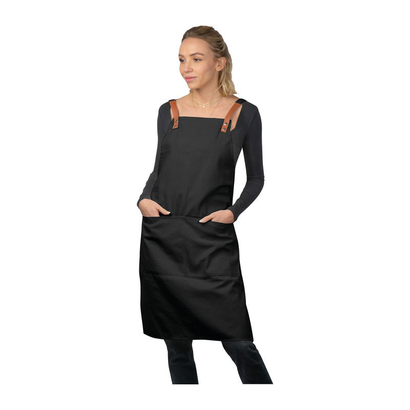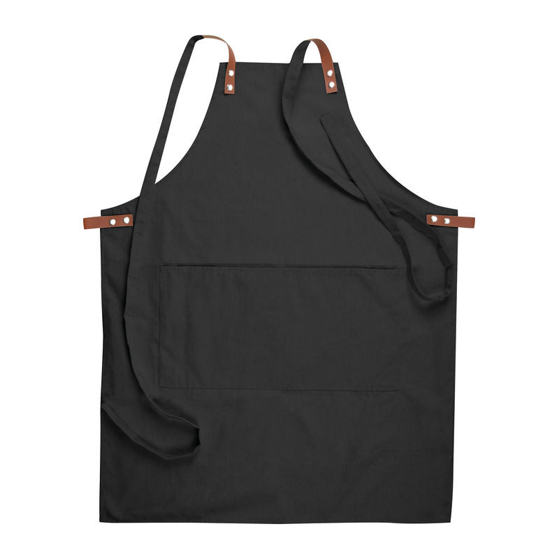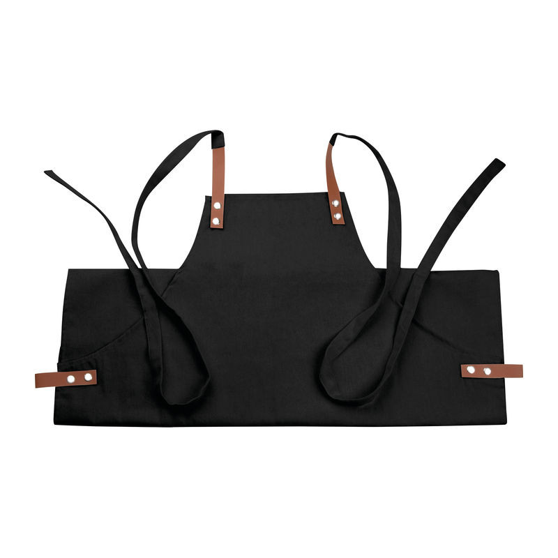 340g-os Oeko-Tex pamutból készült elegáns kötény, két elülső zsebbel és kontrasztos színű PU-ból készült állítható pántokkal.