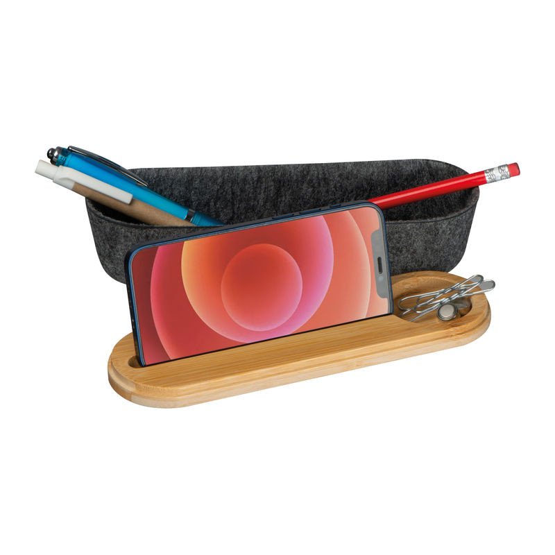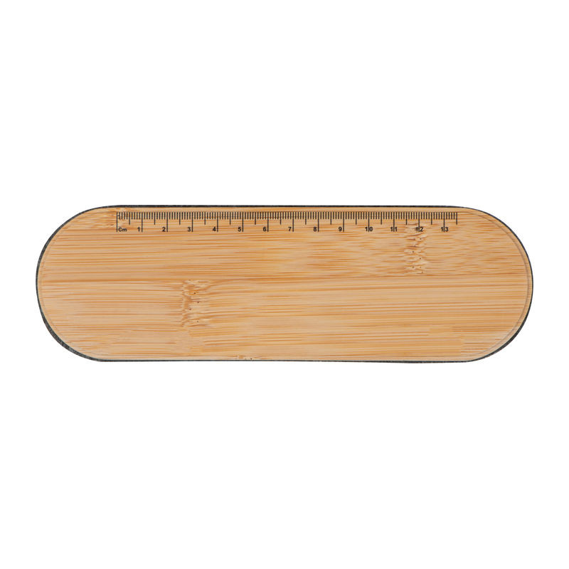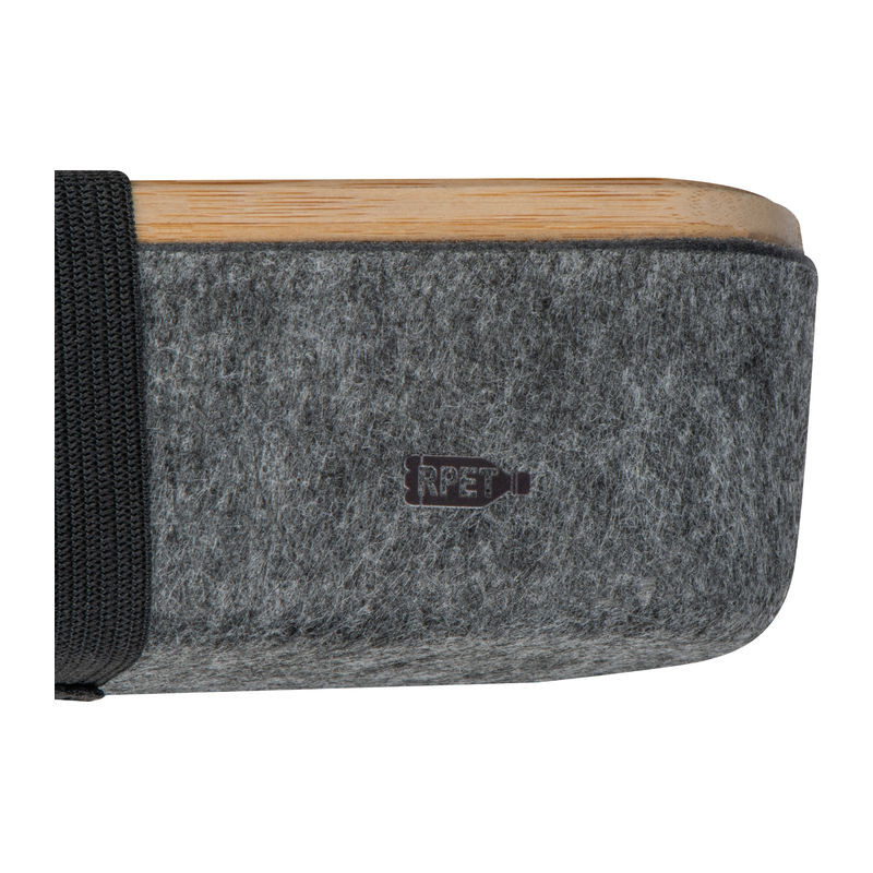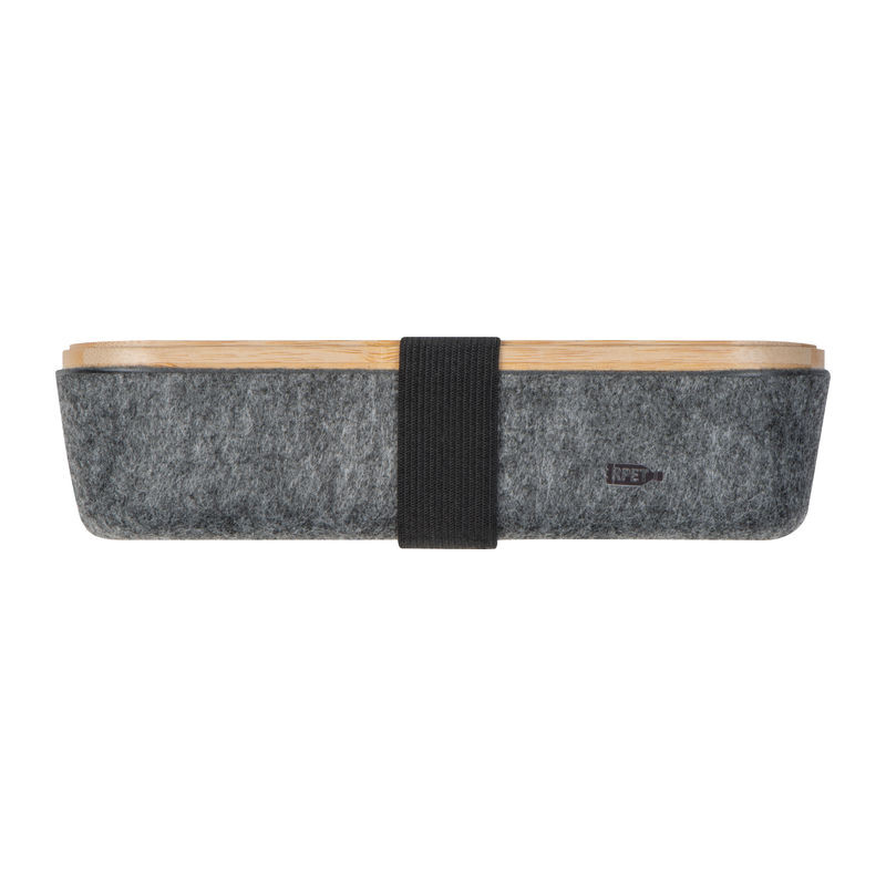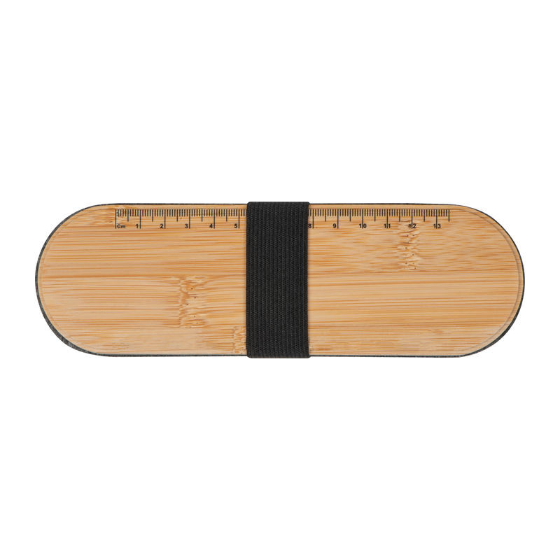 RPET filcből készült írószer tartó bambusz fedéllel, rugalmas lezáró pánttal, vonalzóval. A bambusz fedél okosterlefontartóként is funkcionál.