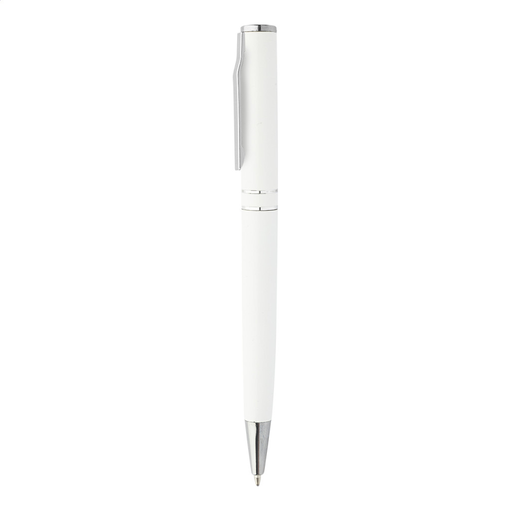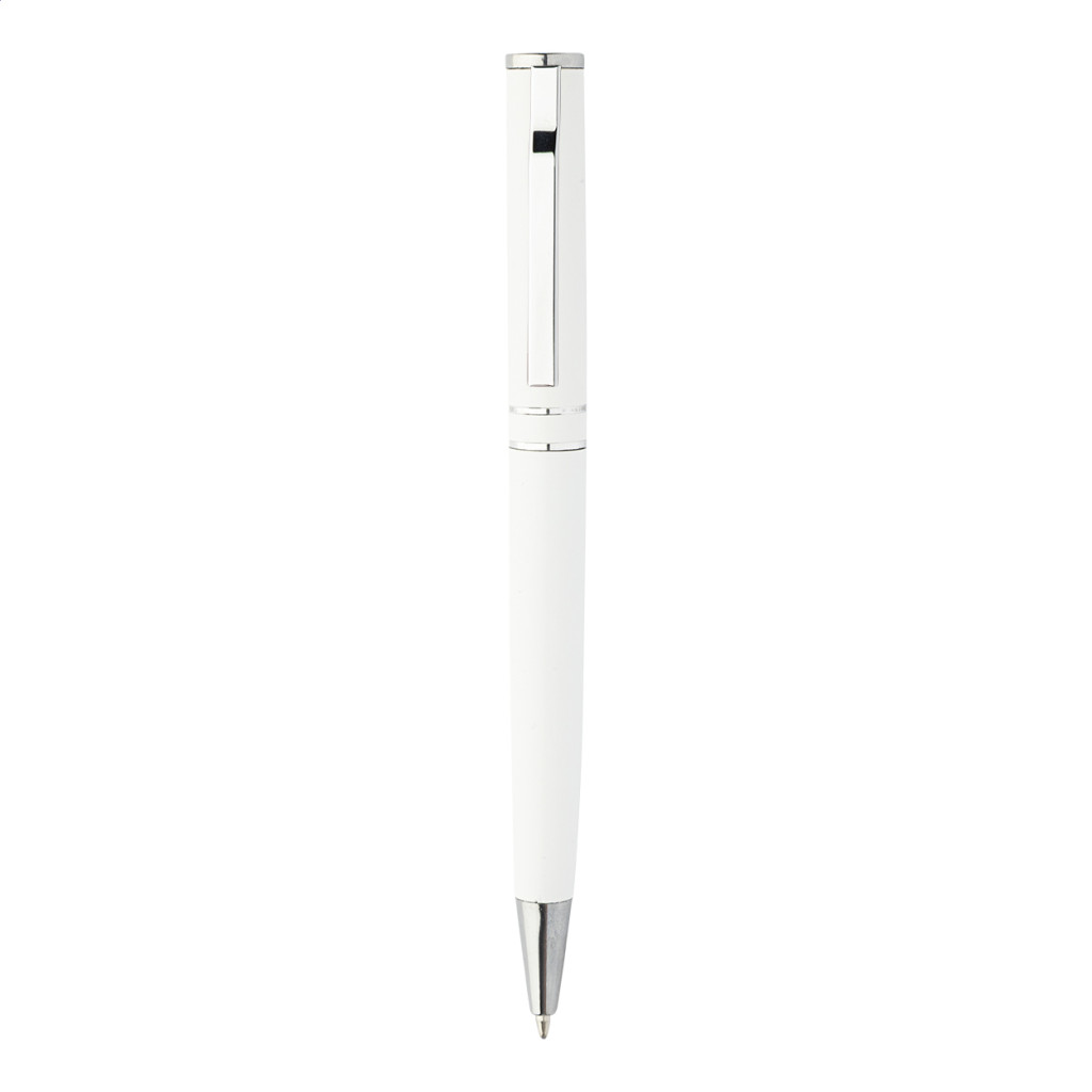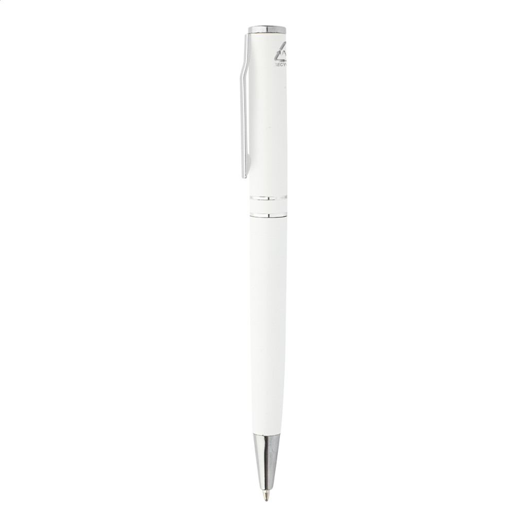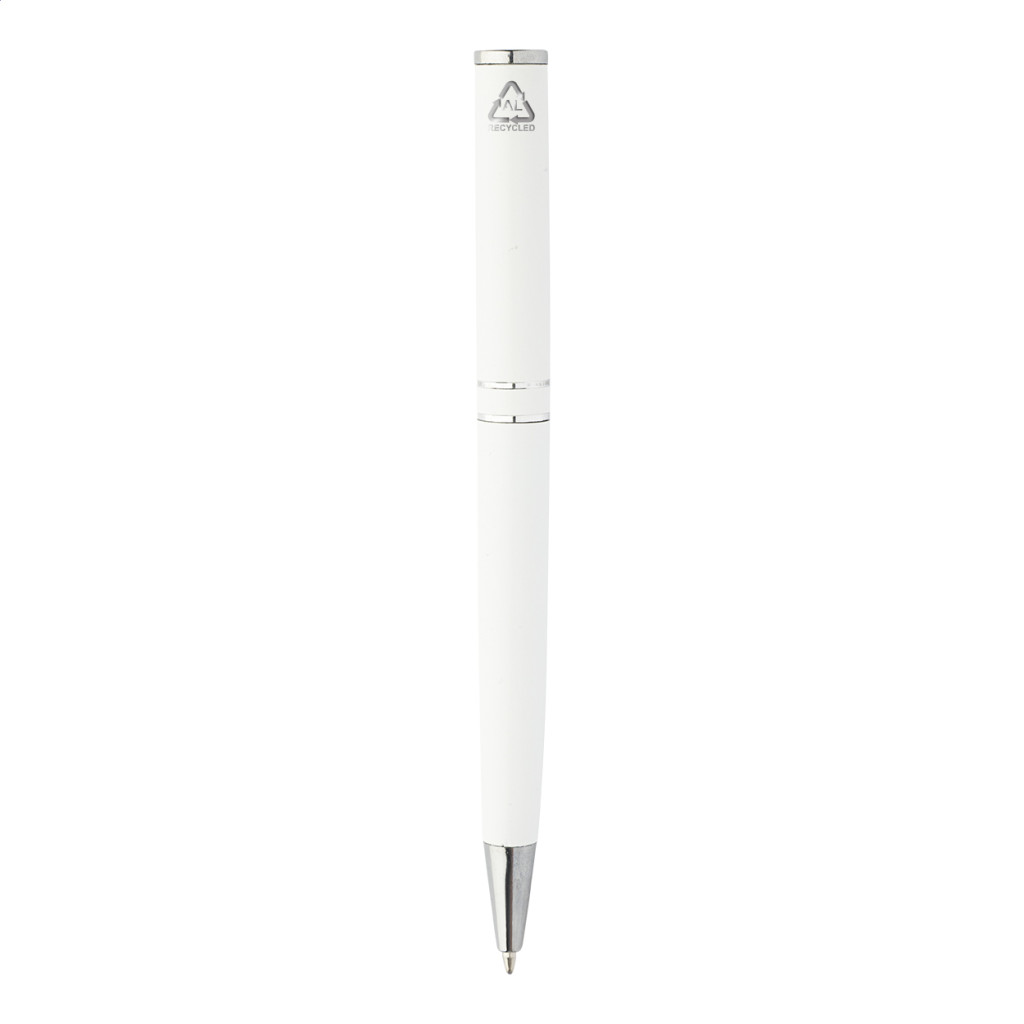 Újrahasznosított alumínium tekerős golyóstoll króm részekkel és gyűrűkkel. Fekete ajándékdobozban. Kék tollbetéttel.