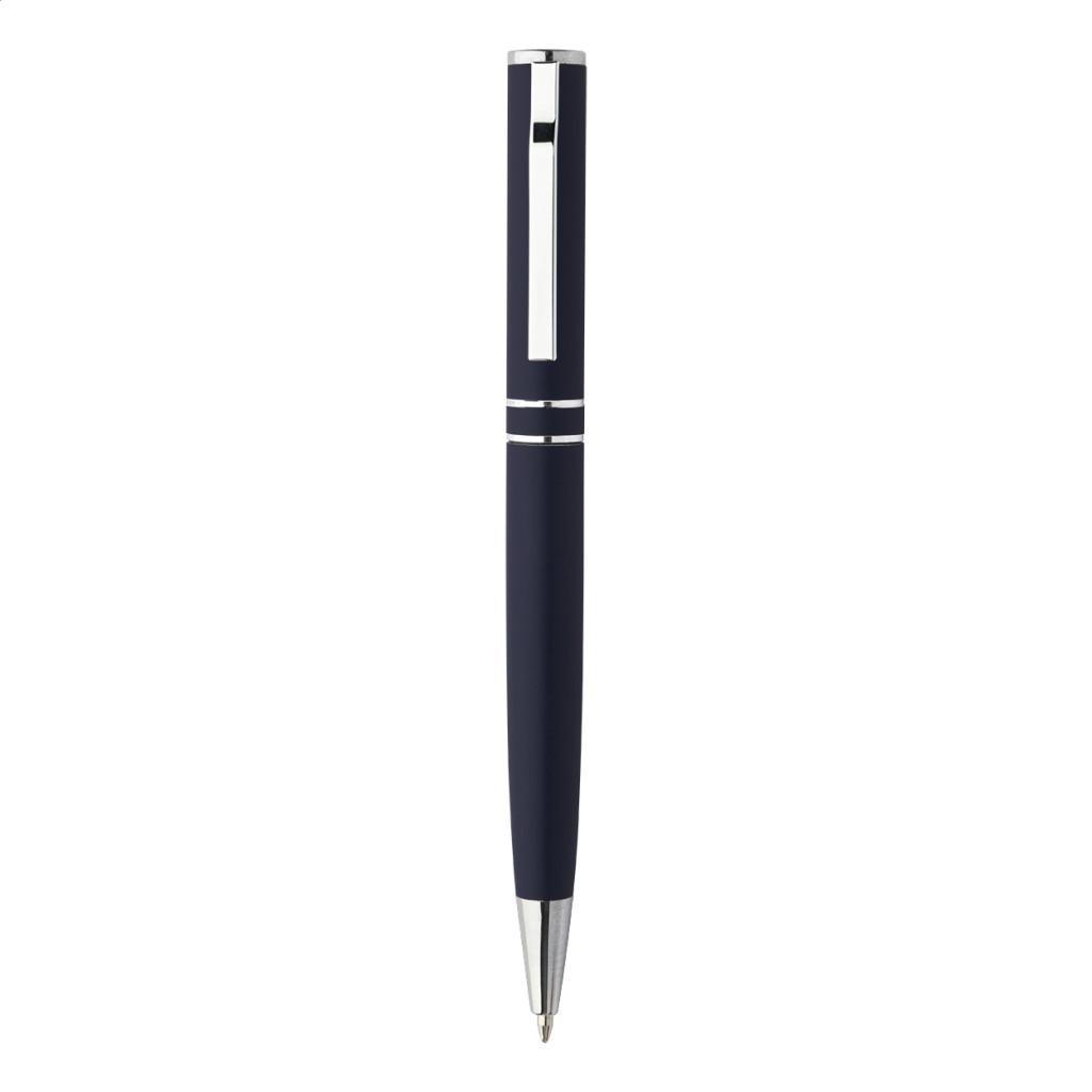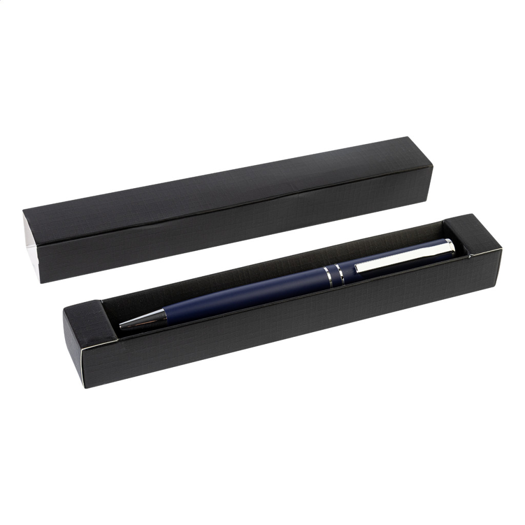 Újrahasznosított alumínium tekerős golyóstoll króm részekkel és gyűrűkkel. Fekete ajándékdobozban. Kék tollbetéttel.