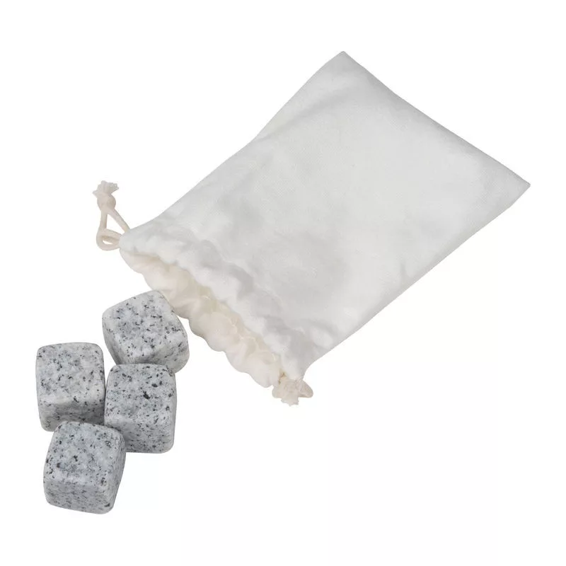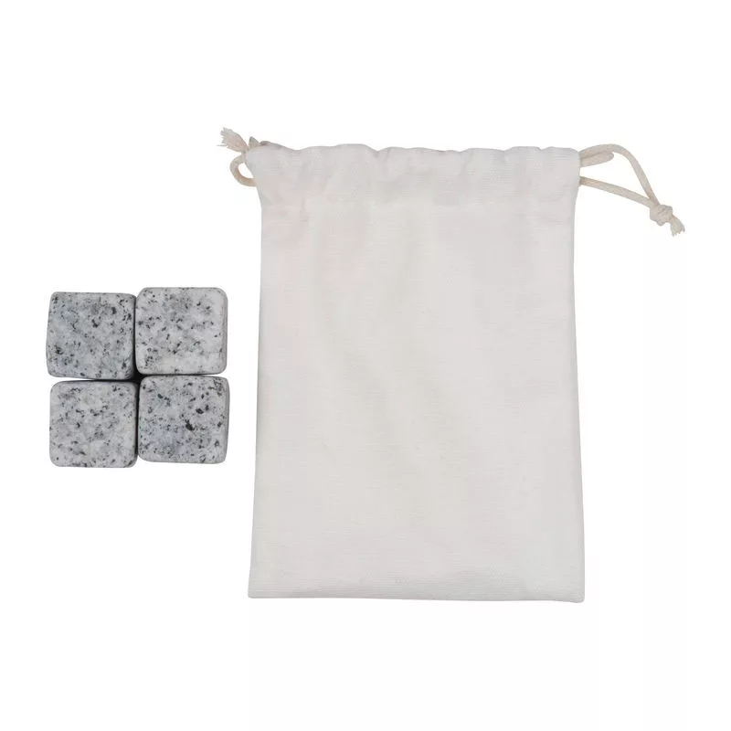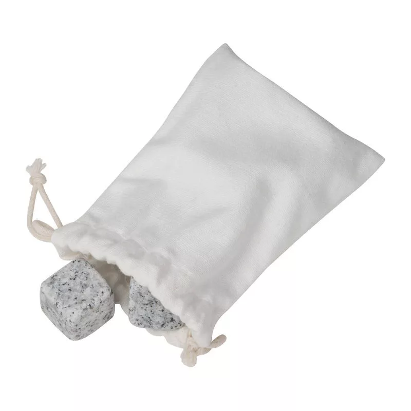4 darab világos színű jégkocka kő, stílusosan csomagolva egy natúr pamut zsákban. Újrahasználható, és tökéletes italok hűtésére anélkül, hogy felhigítanák azt. Elegáns alternatívája a hagyományos jégkockáknak!
