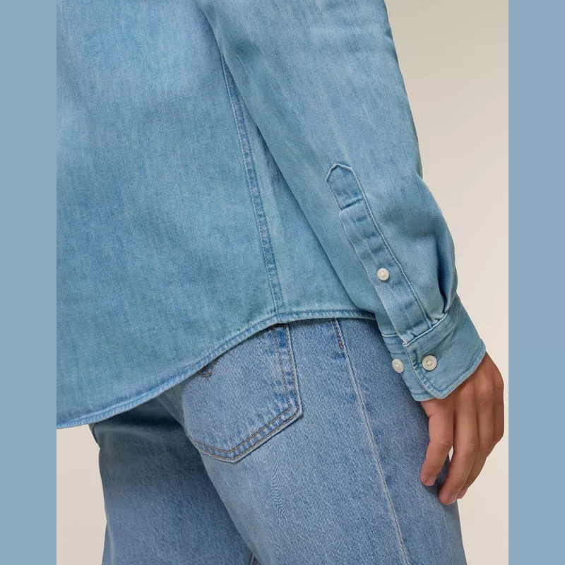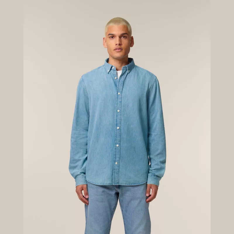 Farmering, legombolható gallérral, 235 g/m² indigo színű, organikus pamutból készült. Sokoldalú és környezetbarát. Pólóra, felsőre rétegezhető vagy önmagában is viselhető. Tökéletesen illik a Stella Denim női Inghez.
