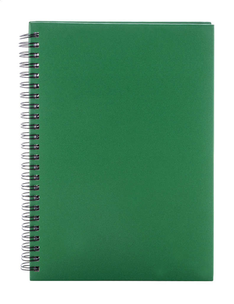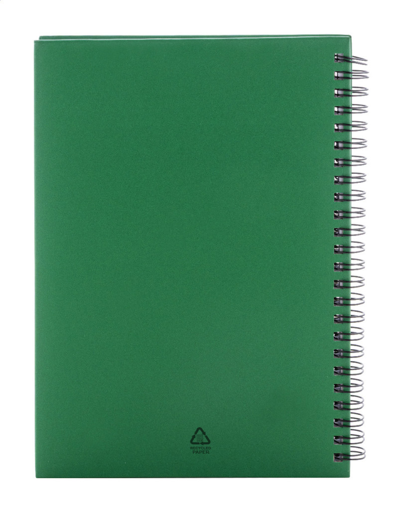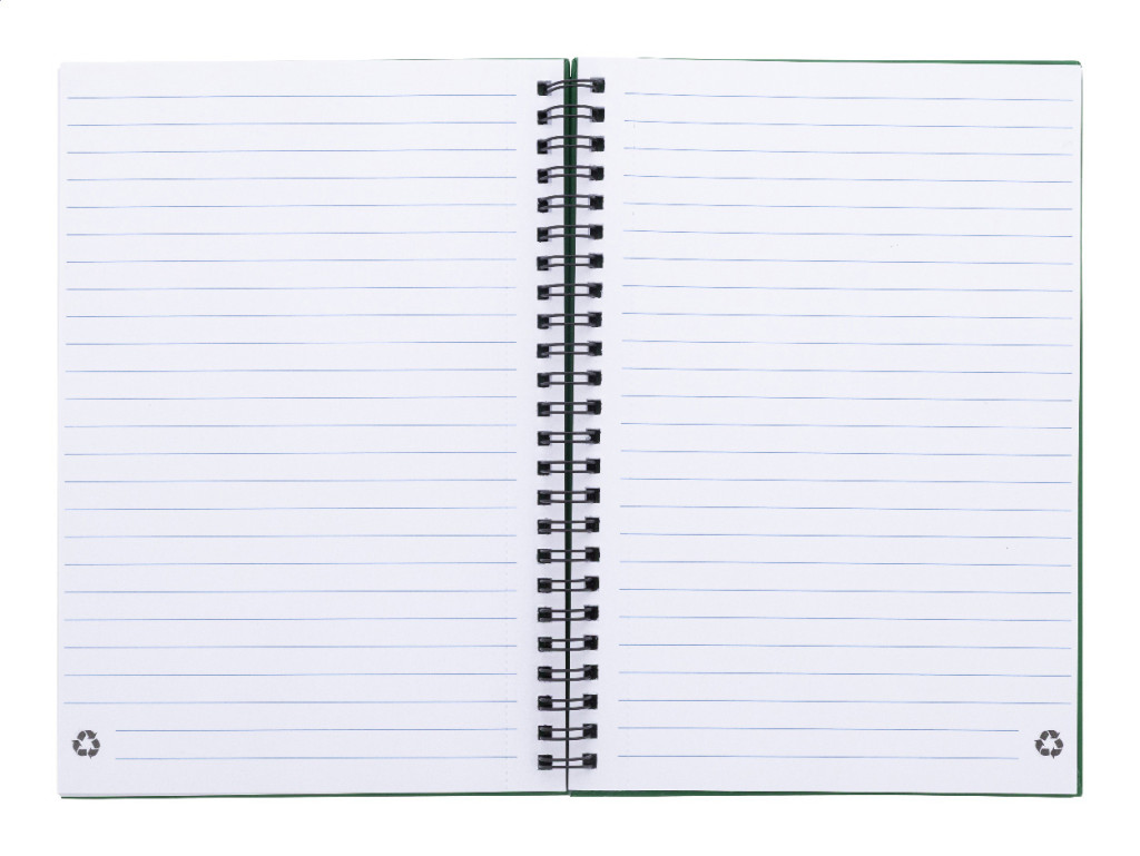 Újrahasznosított papír borítású spirál jegyzetfüzet 80 vonalas lappal, A5 méretű.