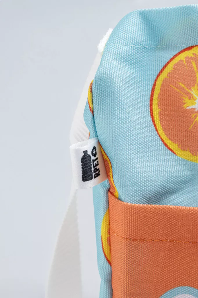 Egyedi gyártású, 600D RPET poliészter válltáska állítható vállpánttal és gombos záródású elülső zsebbel. Teljes felületén szublimációs nyomtatott grafikával és megkülönböztető RPET címkével. Minimális rendelési mennyiség: 25 db.