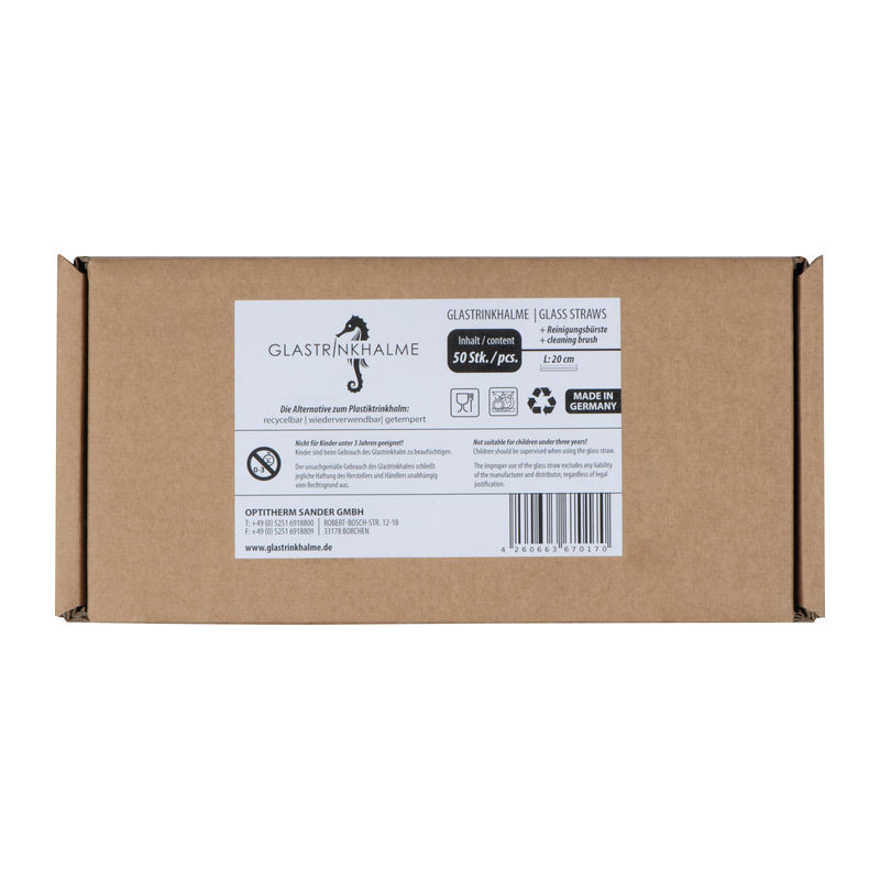 20 cm hosszú, újrahasznosítható, újrafelhasználható szívószál, törhetetlen edzett üvegből, tisztítókefével. Az ár per szívószál értendő. A terméket csak 50 -es egységekben értékesítjük. Mosogatógépben mosható.