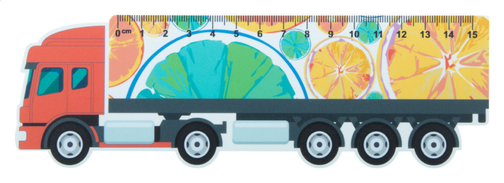 Kamion formájú, 15 cm hosszú műanyag vonalzó egyedi grafikával. Az ár tartalmazza az UV LED nyomtatást az egyik oldalra. Min. rendelés: 100 db.