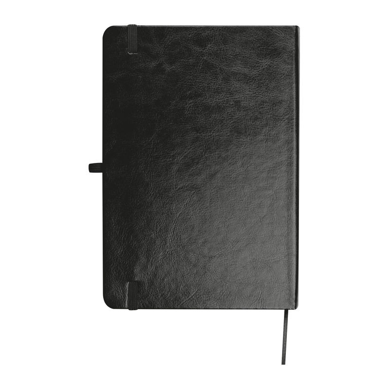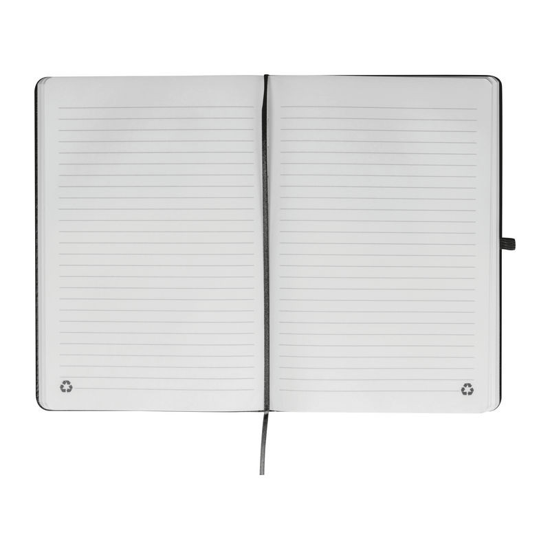 Újrahasznosított A5-ös notesz PU borítással, 192 vonalas oldallal, tolltartó hurokkal és gumipánttal a záráshoz.
