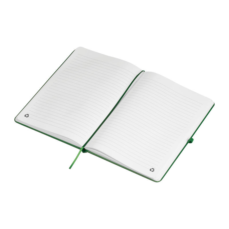 Újrahasznosított A5-ös notesz PU borítással, 192 vonalas oldallal, tolltartó hurokkal és gumipánttal a záráshoz.