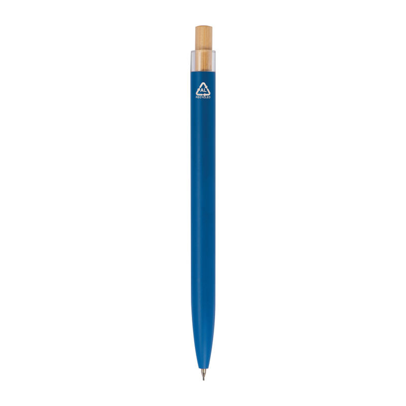 Írószer szett, amely egy kék színű, zselés (Semi-Gel) tollbetéttel ellátott golyóstollat és egy mechanikus töltőceruzát tartalmaz újrahasznosított alumíniumból. Fém klipsz és bambusz nyomógomb tartozik hozzá, környezetbarát dobozban szállítva.