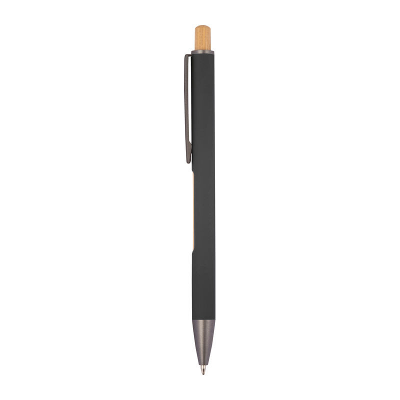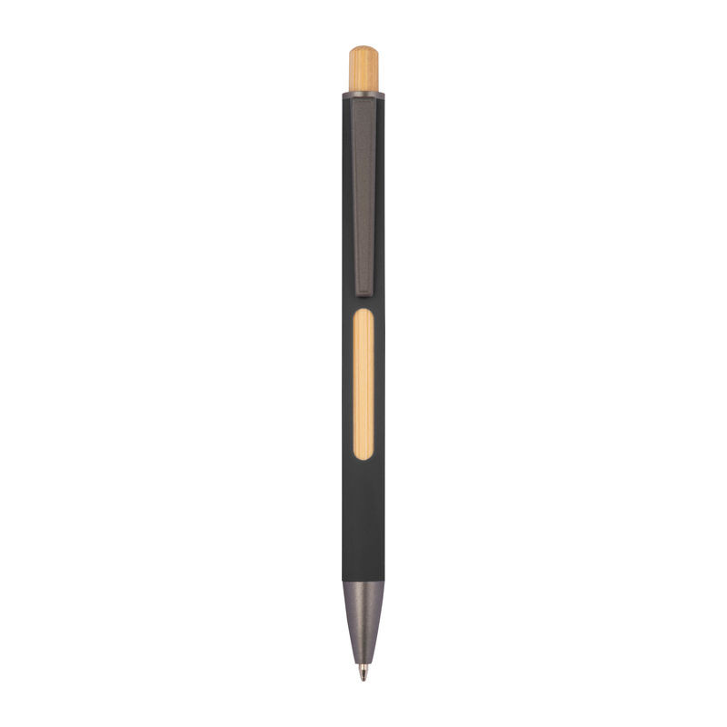 Újrahasznosított alumíniumból készült golyóstoll fekete klipsszel, kék betéttel, bambusz nyomógombbal és bambusz berakással a logónak, akár 6 különböző logó megjelenítésére.