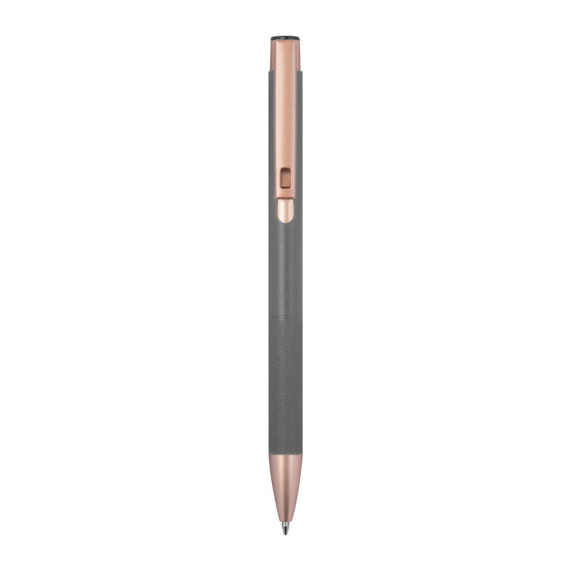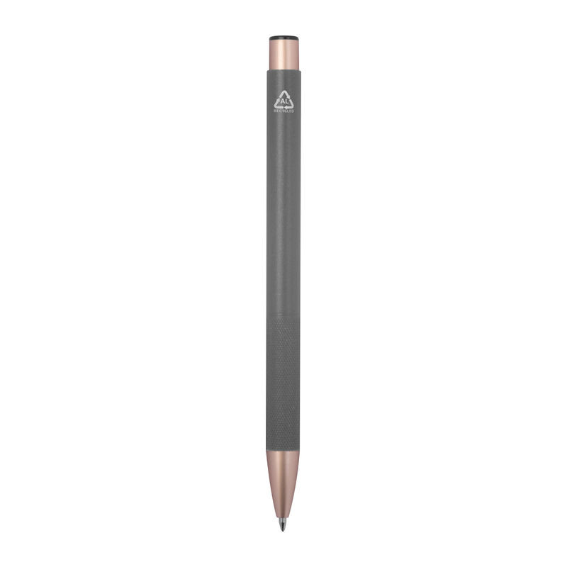 Újrahasznosított alumínium toll rózsaarany (rosegold) díszítéssel, kéken író nagyméretű betéttel és gyémántmintás markolattal.