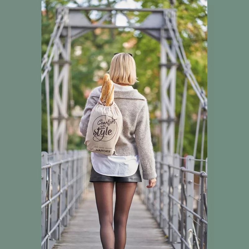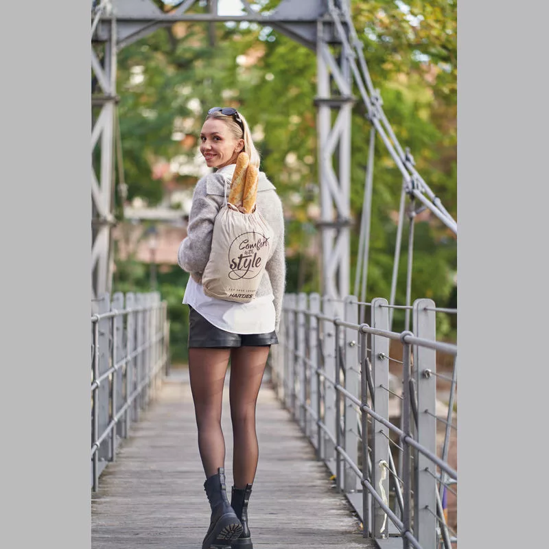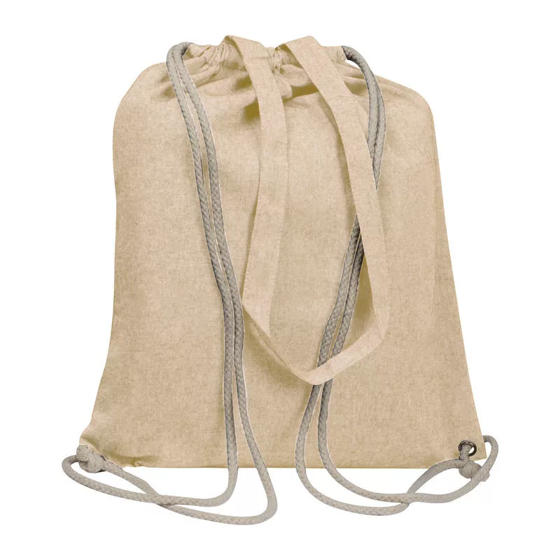 140 grammos OEKO-TEX STANDARD 100 minősítésű tornazsák újrahasznosított pamutból, vállra akasztható hosszú füllel és húzózsínórral.