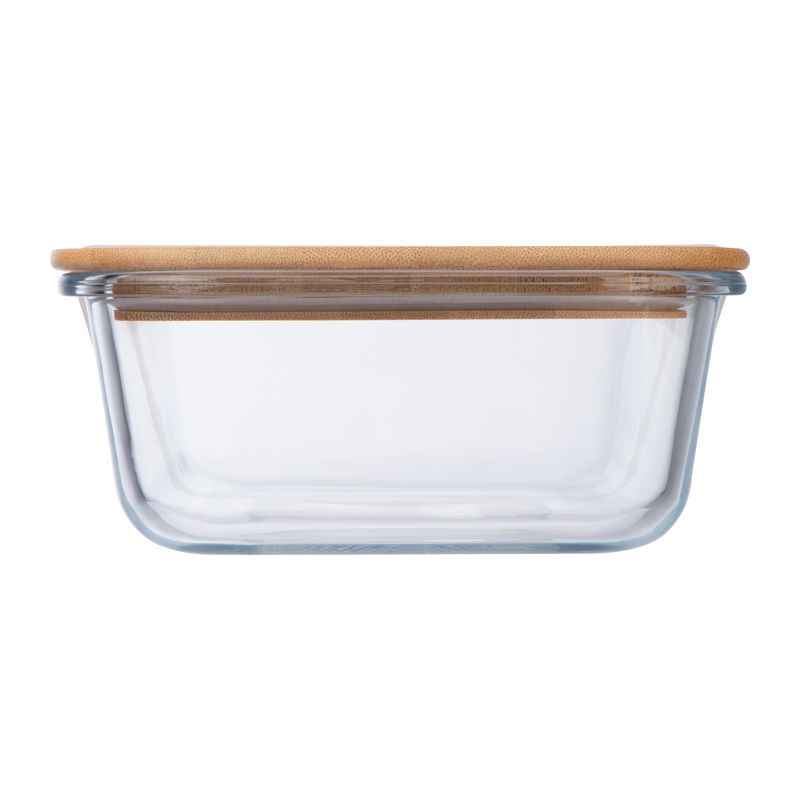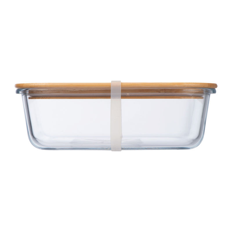 Boroszilikát üveg uzsonnás- vagy ételhordó doboz, bambusz tetővel, szilikon zárópánttal.