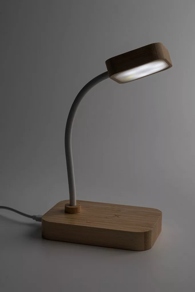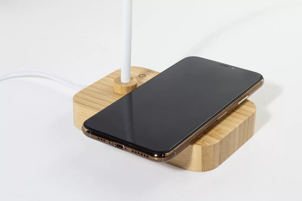 Bambuszból készült multifunkcionális asztali lámpa 12 LED-del és beépített vezeték nélküli gyorstöltővel (15W). Meleg, természetes és hideg fénymódokkal, állítható fényerővel. USB töltőkábellel.